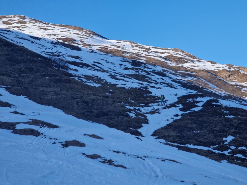 Die Route sulzt im Tagesverlauf sehr auf, was die Passagen zu Fuß einfach macht. Die Abfahrt dann dementsprechend frühlingshaft, aber man sollte nicht zu spät dran sein, weil der Schnee im Schatten sofort wieder vereist. Es hat gerade genug Schnee, um keine Steine zu erwischen.