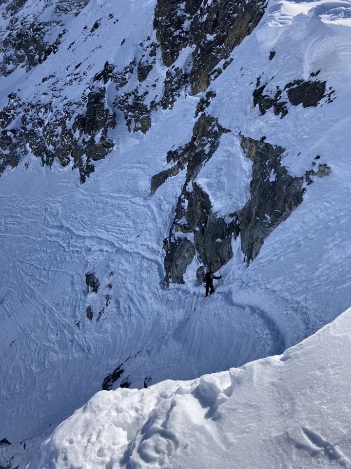 Lieber die Traverse beim Frühstücksplatz in der Abfahrt nicht mit Ski befahren, sondern zu Fuß abzusteigen, damit die Spur erhalten bleibt.