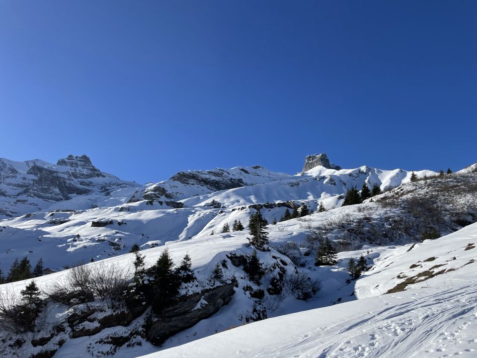 Recht gute Verhältnisse. Skitragen von Tschingel bis Griesalp (aper oder gesplittet). Ab der Griesalp materialschonender entlang der Alpstrasse und nicht über den Waldweg. Bis etwa 2700m.ü.M. mit Ski, die letzten Minuten zu Fuss, da kein Schnee. Abfahrt über Bundläger wechselnde Verhältnisse, oft wingeprägt aber auch einige Schwünge im Powder. Auf der Sonnseite des Kientals grün bis zu den Gipfeln...