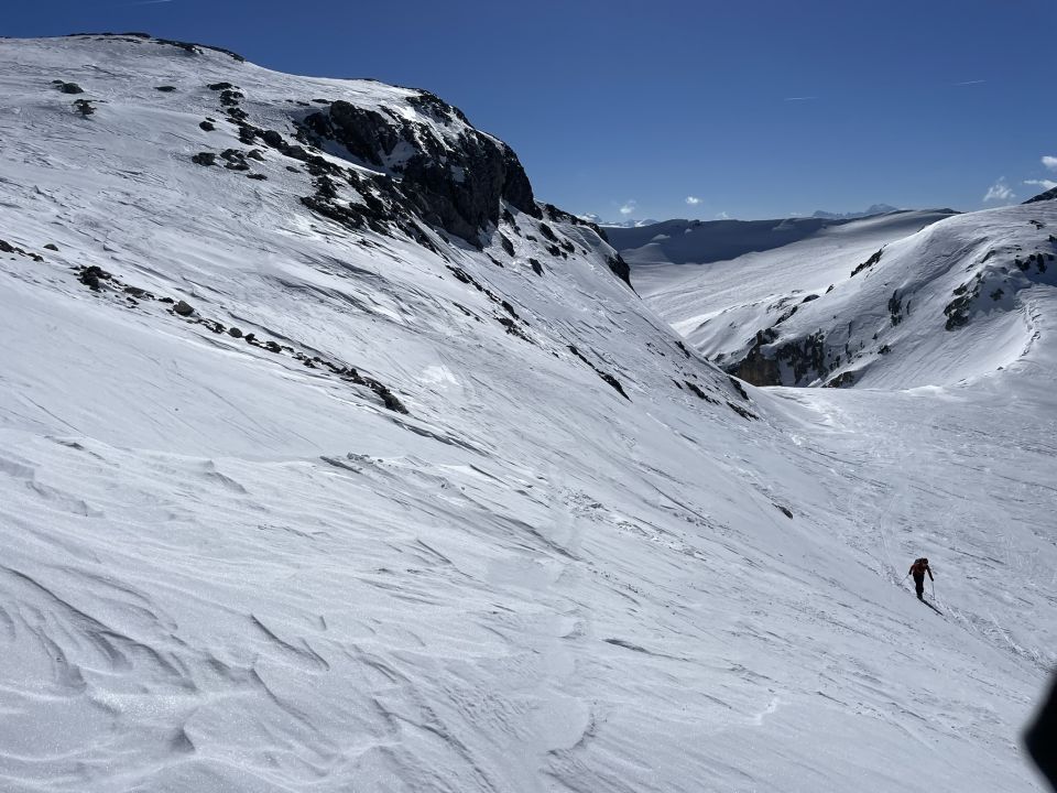 Fast im ganzen Aufstieg Harscheisen benutzt. Am Frühstücksplatz dann Ski getragen. Wir haben sowohl im Auf als auch im Abstieg Steigeisen benutzt. Geht dann doch sicherer und schneller. Haben die Ski dann ein Stückchen weiter getragen. Abfahrt besser als erwartet. Sind rechts rüber bis übers Skigebiet traversiert. Ging erstaunlich gut ohne einzubrechen. Pulver kann man ja z. Zt. eh nicht erwarten. Wenig los im Gebiet. Abfahrt vom Mittelgipfel zur Lämmerenhütte sah gut aus.