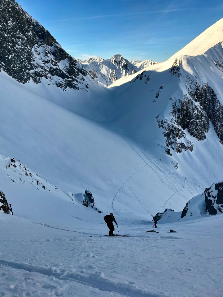 Schattseitig schöner Pulver. Wiederaufstieg zum Kühkarjöchle sehr spannend, da es zu wenig Schnee in der Latschenzone hat.
