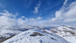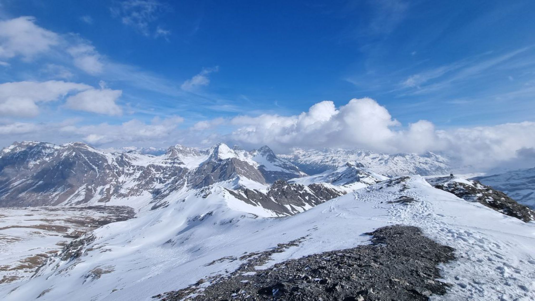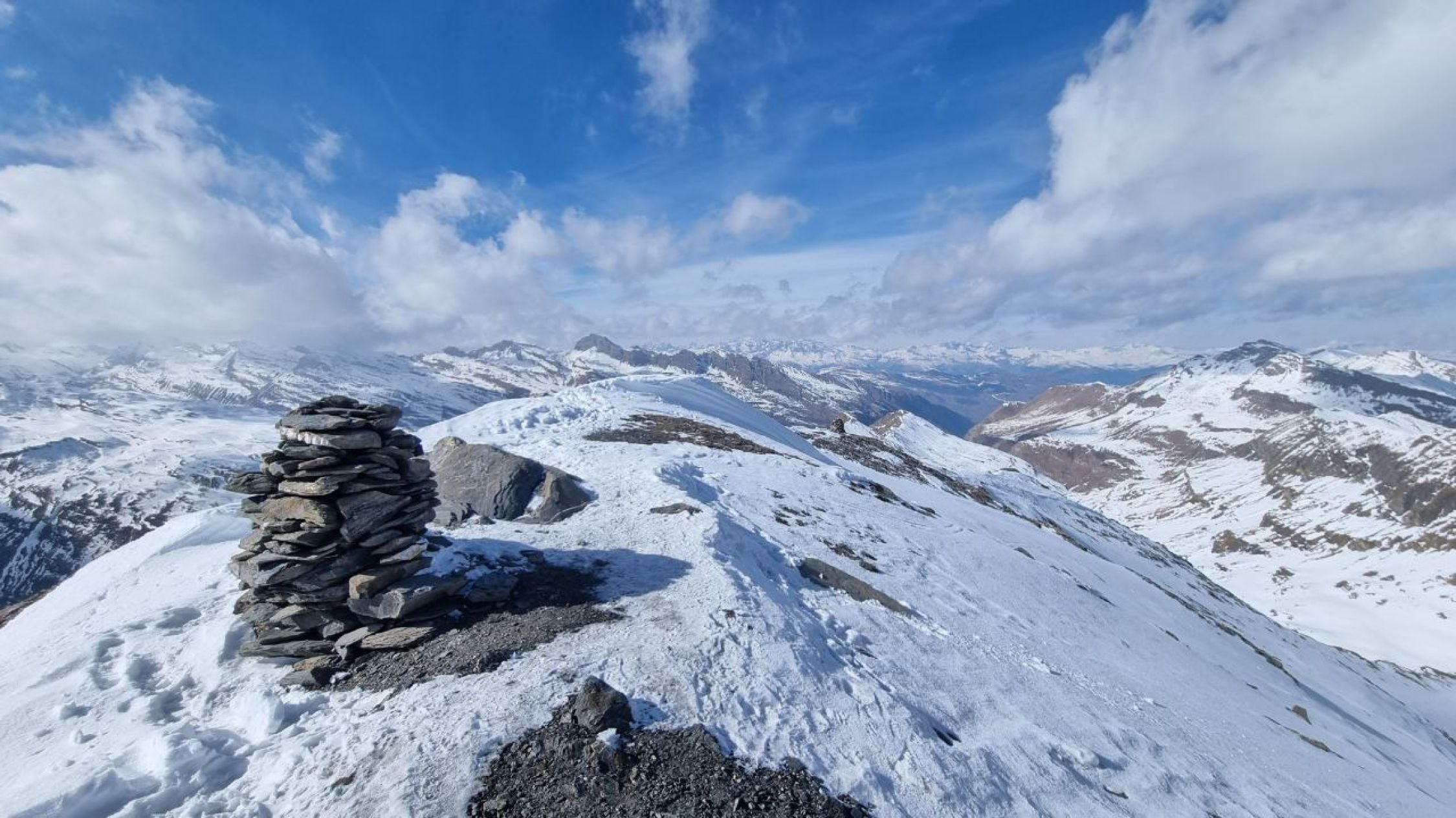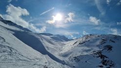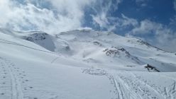 Oberhalb 2200m dann sehr guter Pulver auf harter Unterlage und in der Abfahrt "ausgezeichnet" zu fahren. Gipfelhang teils hart, teils Pulver auf harter Unterlage und mit Ski bis fast auf den Gipfel möglich.