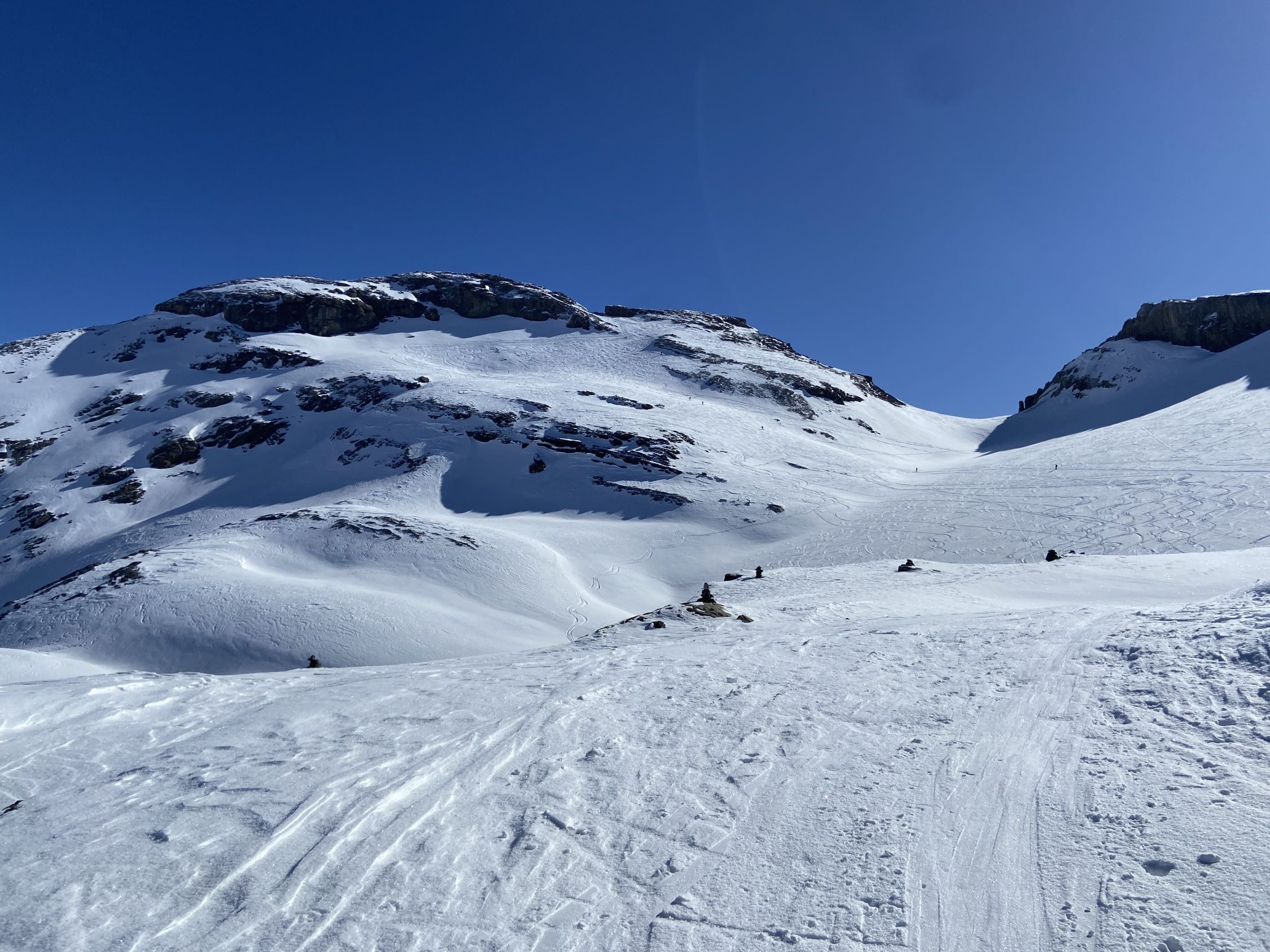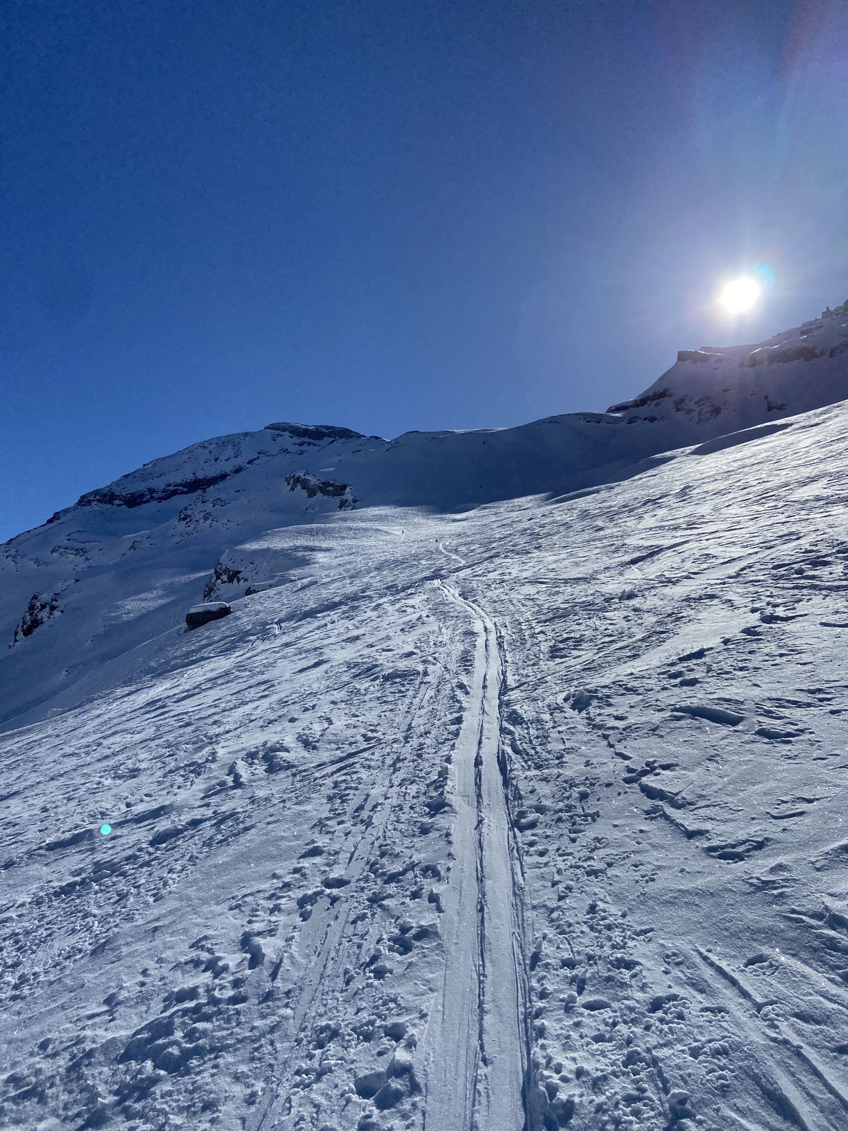 Mit einer sehr guten Spur geht es gegen den Gipfel zu. Die Abfahrt ist teils pistenartig, teils hat es auch noch Pulverschnee.