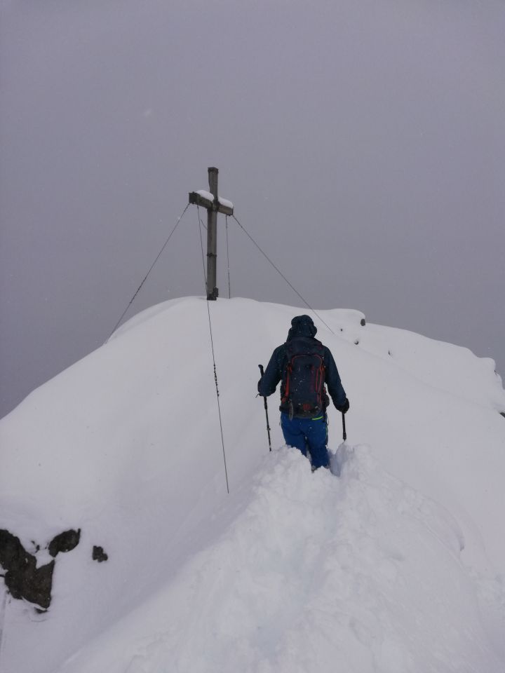 Juhu, mit diesem Neuschnee eine wunderschöne - winterliche - Skitour auf die Tschaggunser Mittagspitze. Trotz leichtem Schneefall und Nebel sehr gut machbar. Die 70hm zum Gipfel in kompakten Schnee machte die Stapferei etwas einfacher. Immer spannend als erster nach der Kraxelei die paar Meter zum Kreuz hinüber, geht es doch rechts und links recht steil hinunter und bei so viel Schnee heisst es achtsam zu sein und den Grat richtig antreffen.