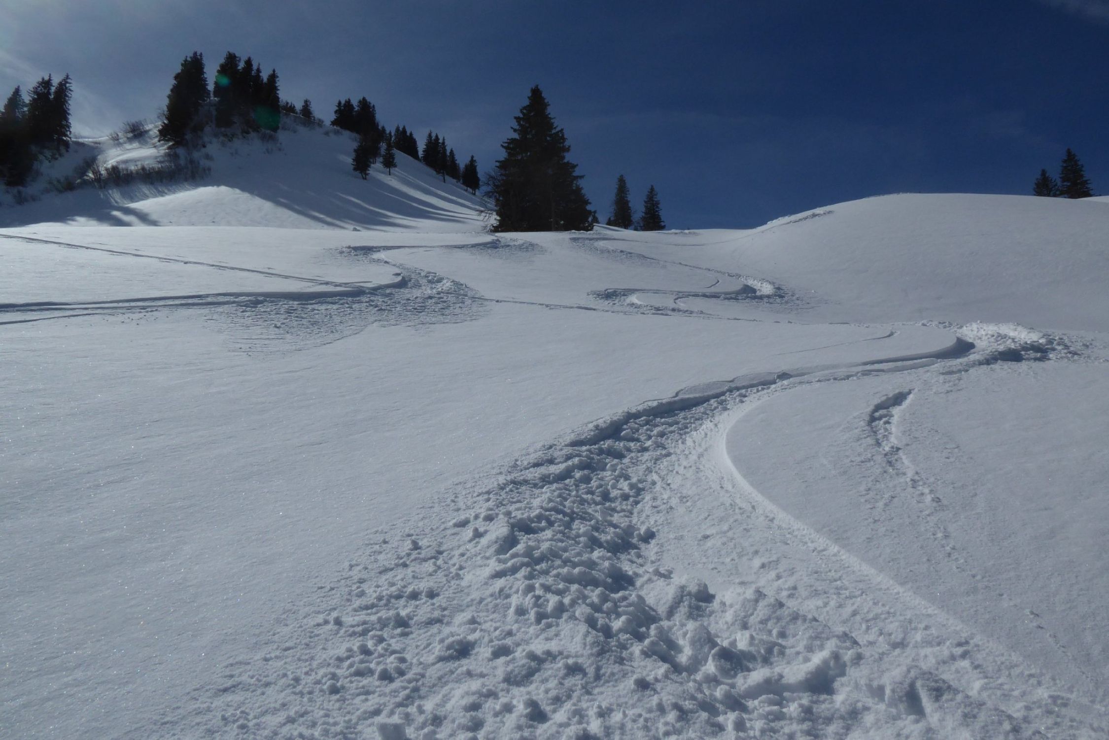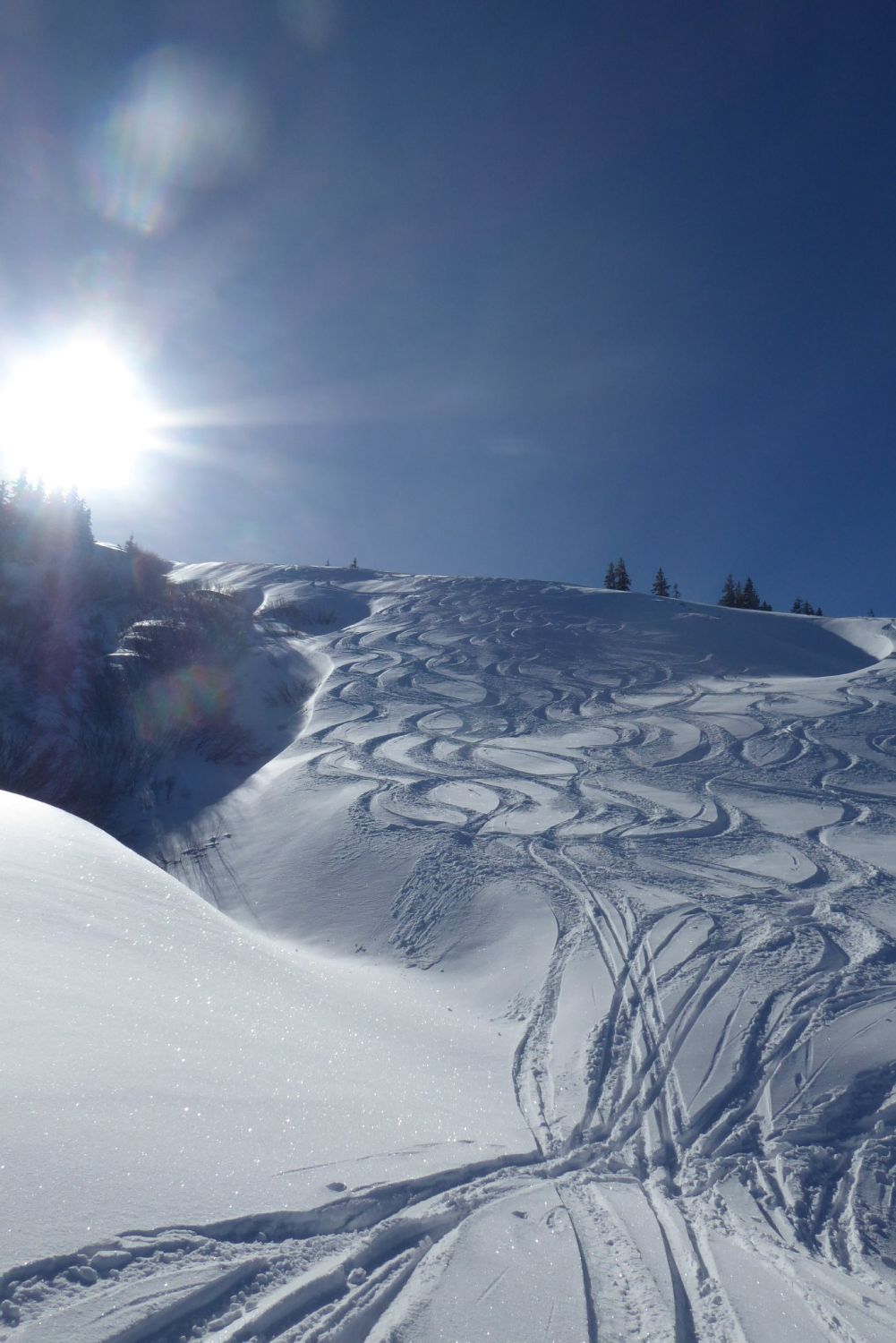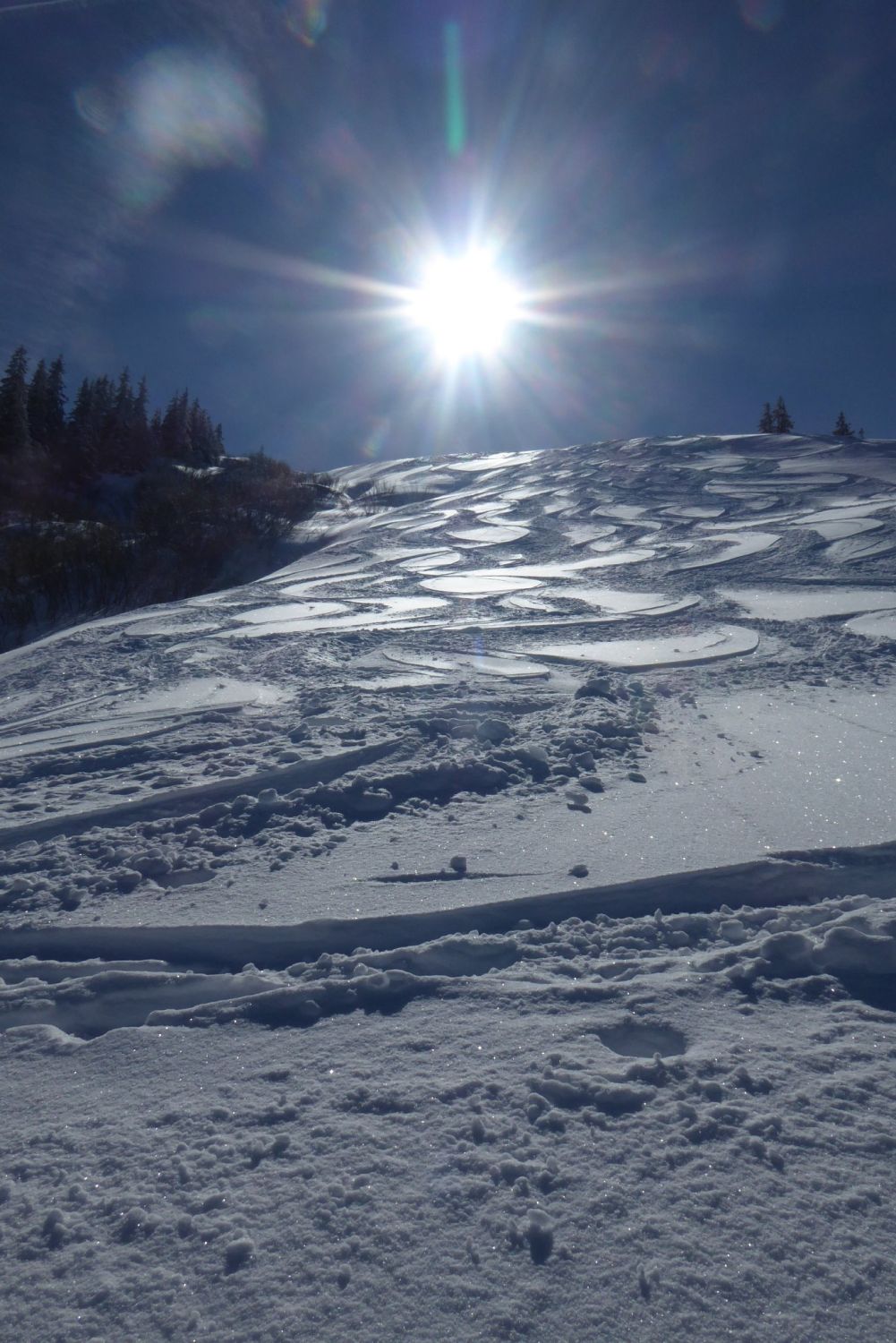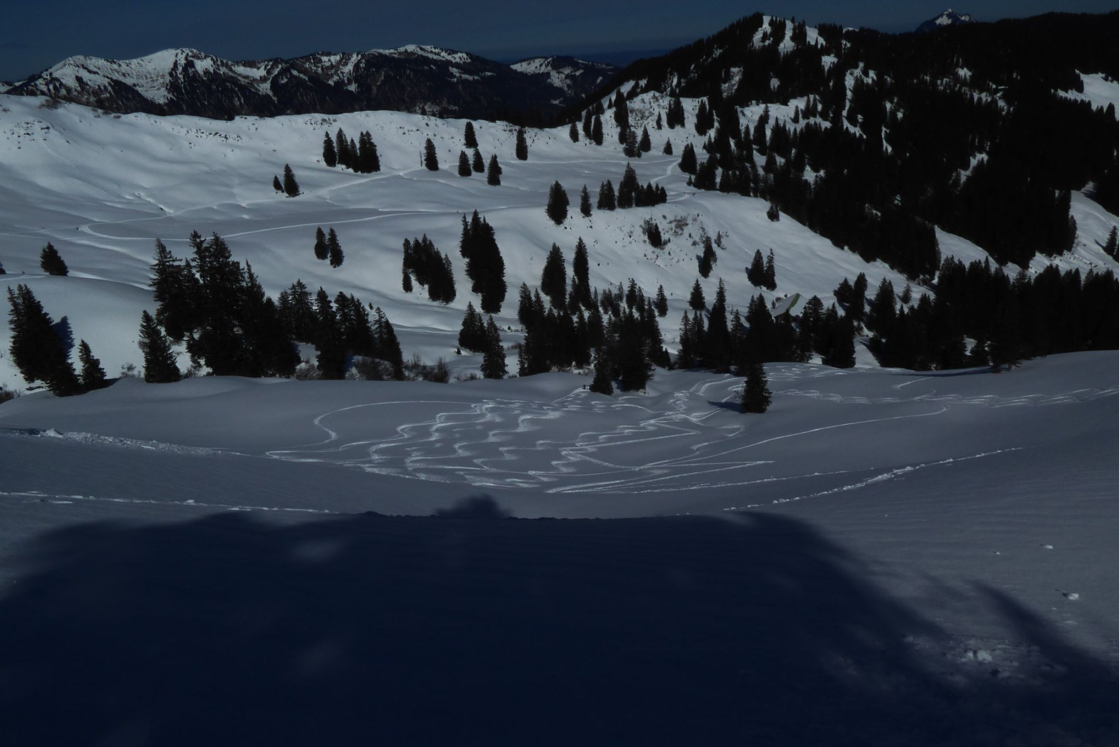 Start 8:40 noch etwas frisch. Gute Spur zum Südrücken und Top Verhältnisse nach Westen runter (Riedberghornlift BergStat.). Schon etwas eingefahren aber auch noch Platz für eigene Linie. Auch in vorhandenen Spuren alles noch bestens locker und gut zu drehen. Wiederanstieg in noch "unversauter" flotter, griffiger Spur. 3malige Abfahrt in die Bolgenseite bei Ideal Verhältnisse. Beim 1. Aufstieg war ich überrascht wie wenig auf der gesamten Grasgehren Seite verspurt war. Das hat sich im Laufe des Tages natürlich geändert. Mehr Fußvolk mit oder ohne Hilfmittel unterwegs wie Skitürler. Insgesamt 1200 Hm und 5 Std.