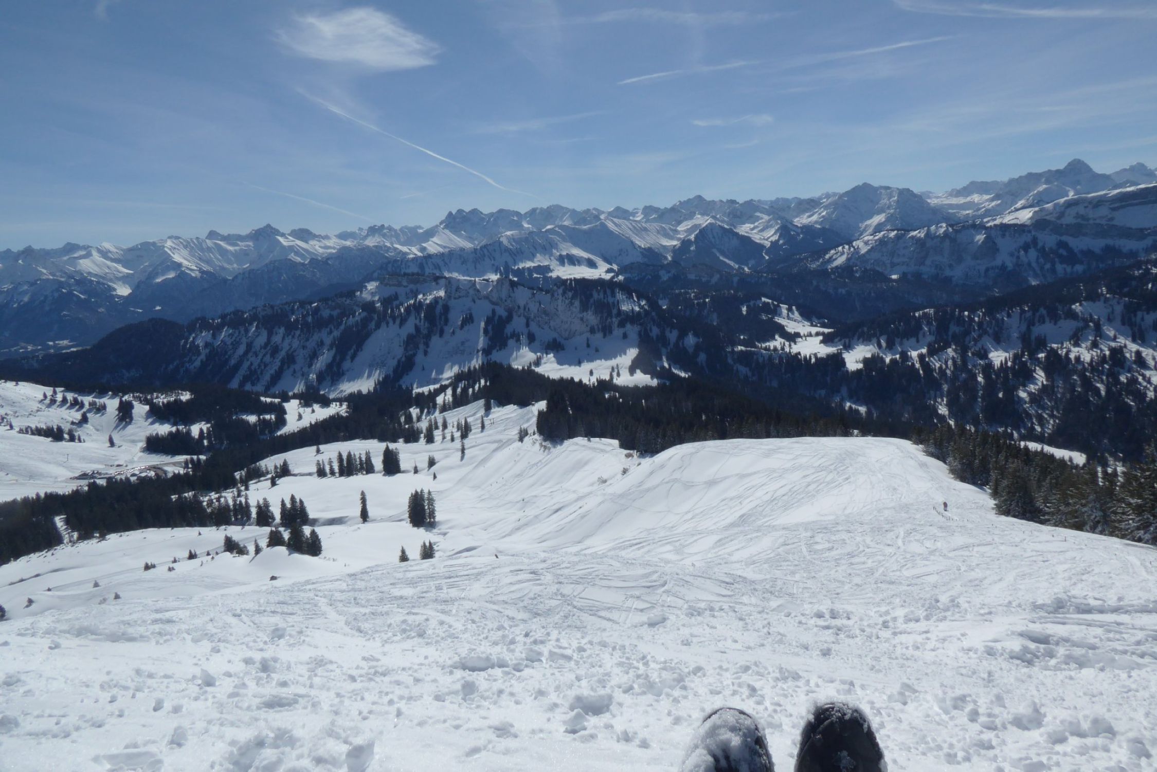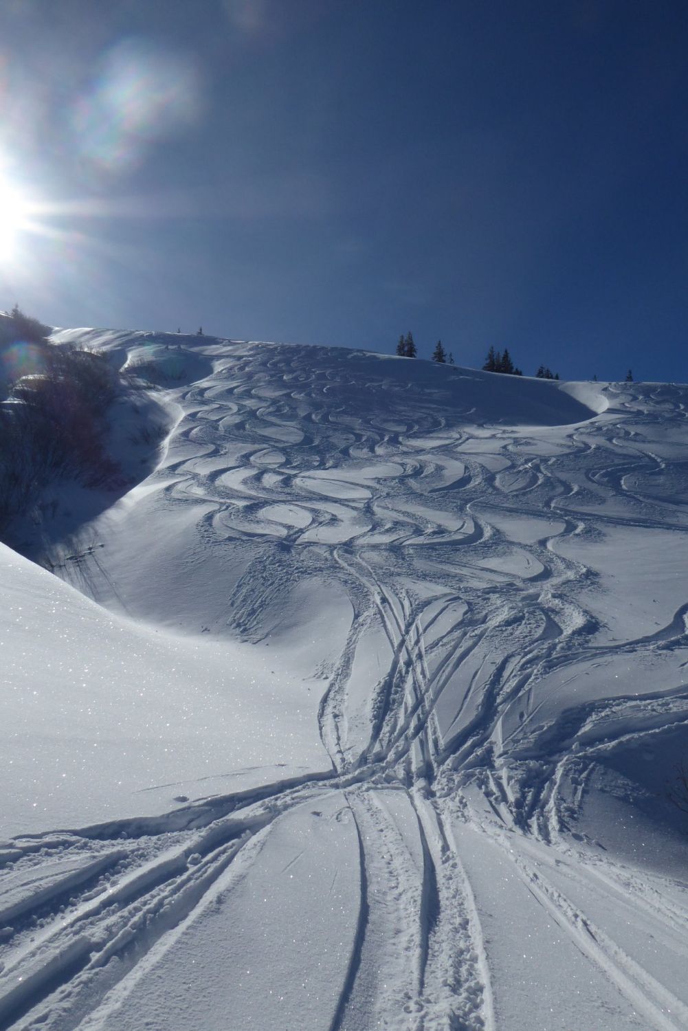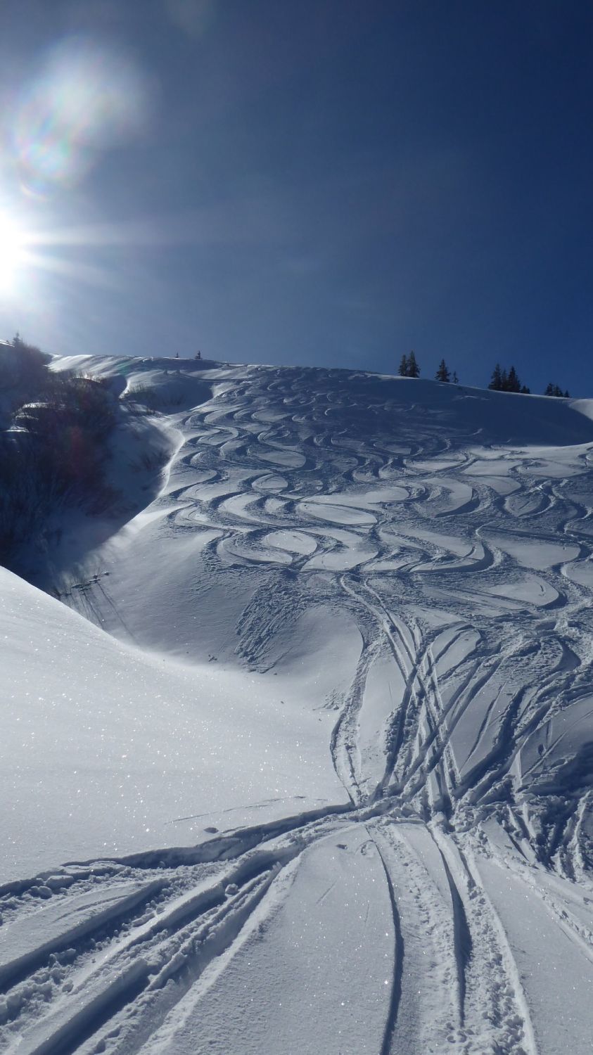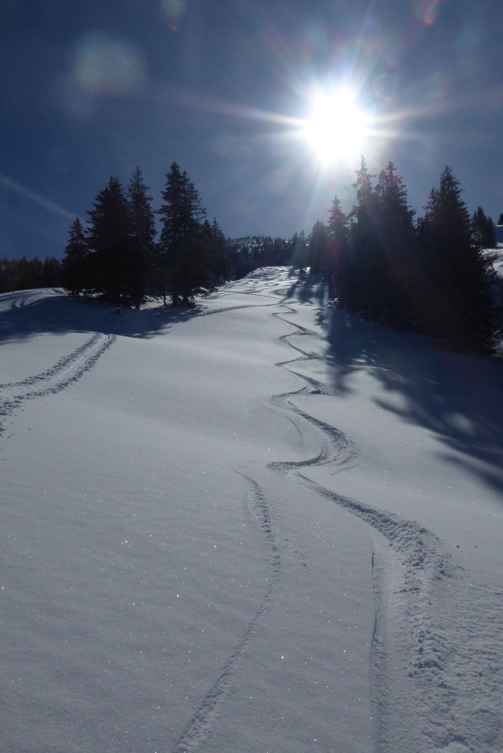 Start 8:40 noch etwas frisch. Gute Spur zum Südrücken und Top Verhältnisse nach Westen runter (Riedberghornlift BergStat.). Schon etwas eingefahren aber auch noch Platz für eigene Linie. Auch in vorhandenen Spuren alles noch bestens locker und gut zu drehen. Wiederanstieg in noch "unversauter" flotter, griffiger Spur. 3malige Abfahrt in die Bolgenseite bei Ideal Verhältnisse. Beim 1. Aufstieg war ich überrascht wie wenig auf der gesamten Grasgehren Seite verspurt war. Das hat sich im Laufe des Tages natürlich geändert. Mehr Fußvolk mit oder ohne Hilfmittel unterwegs wie Skitürler. Insgesamt 1200 Hm und 5 Std.