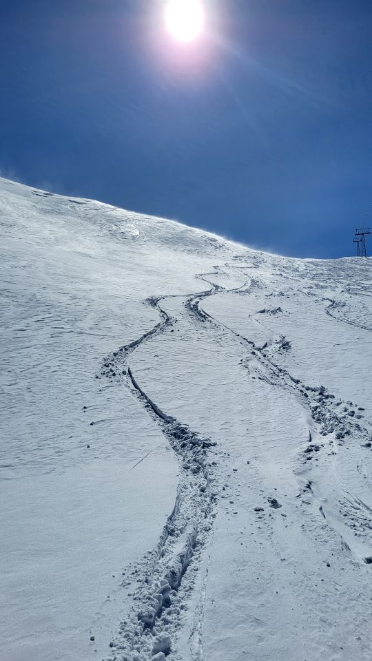 Starker Wind und windgepresster Schnee, welcher stark erfahren ist. Nur der wolkenlosen Himmel hat entschädigt.