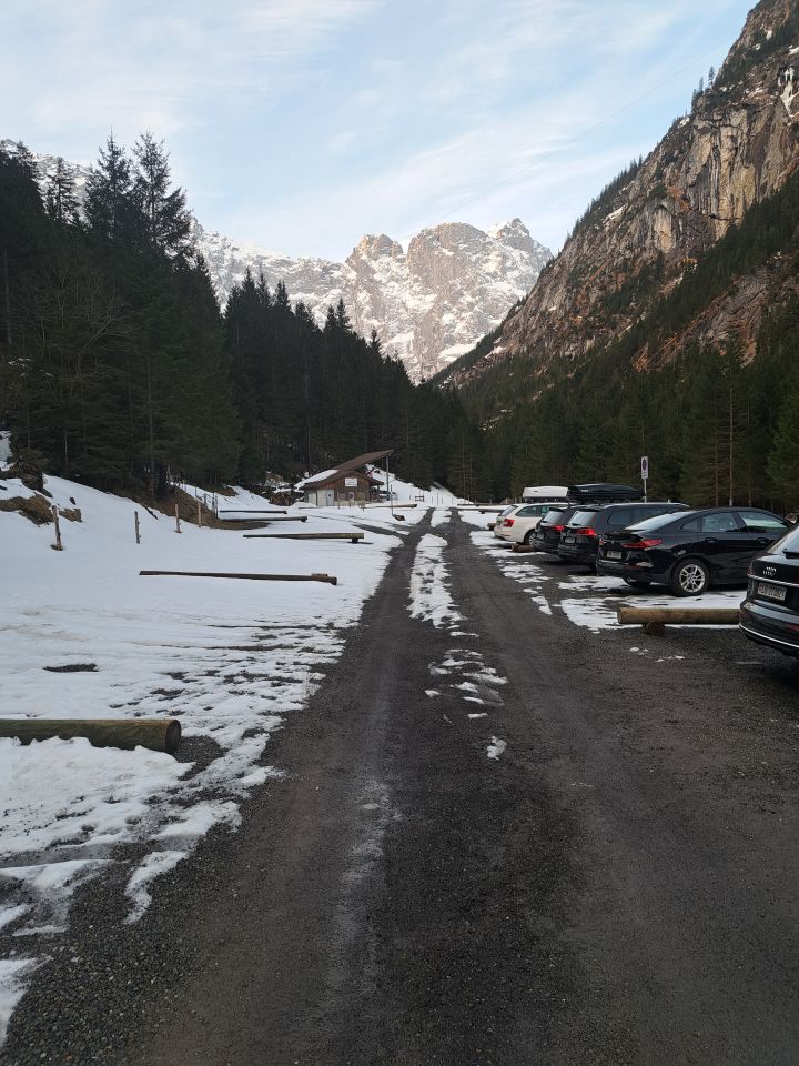 Abfahrt auf der Strasse noch gut machbar, und dann eben 20 Minuten Ski tragen.
