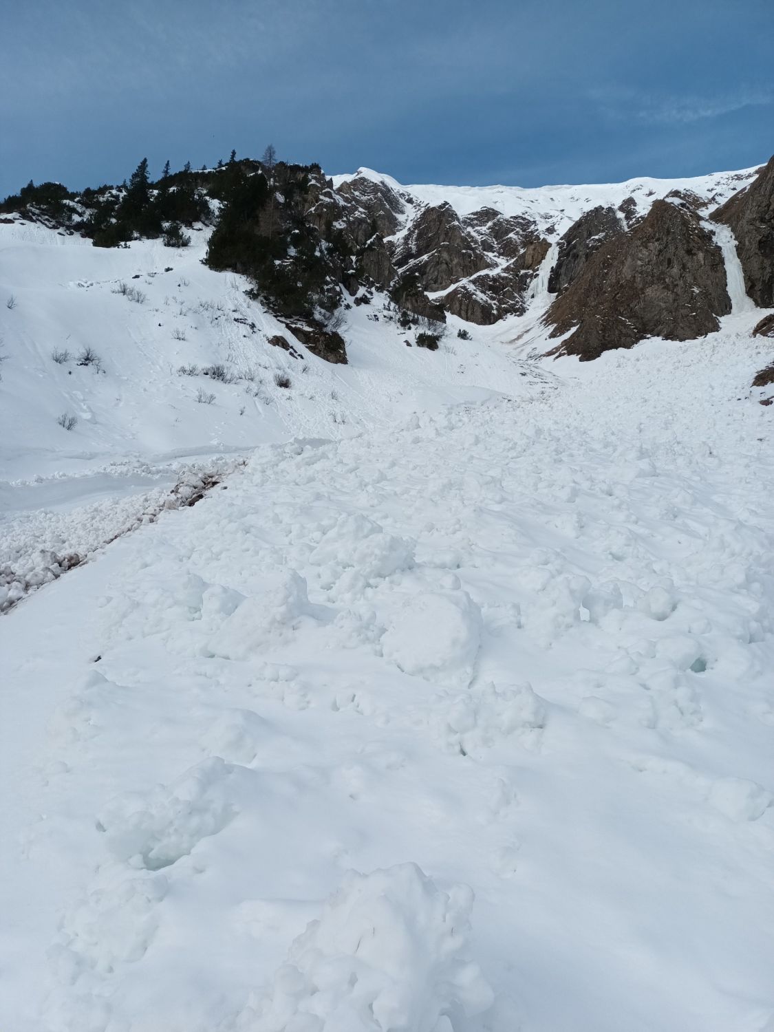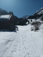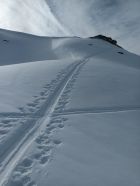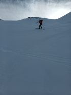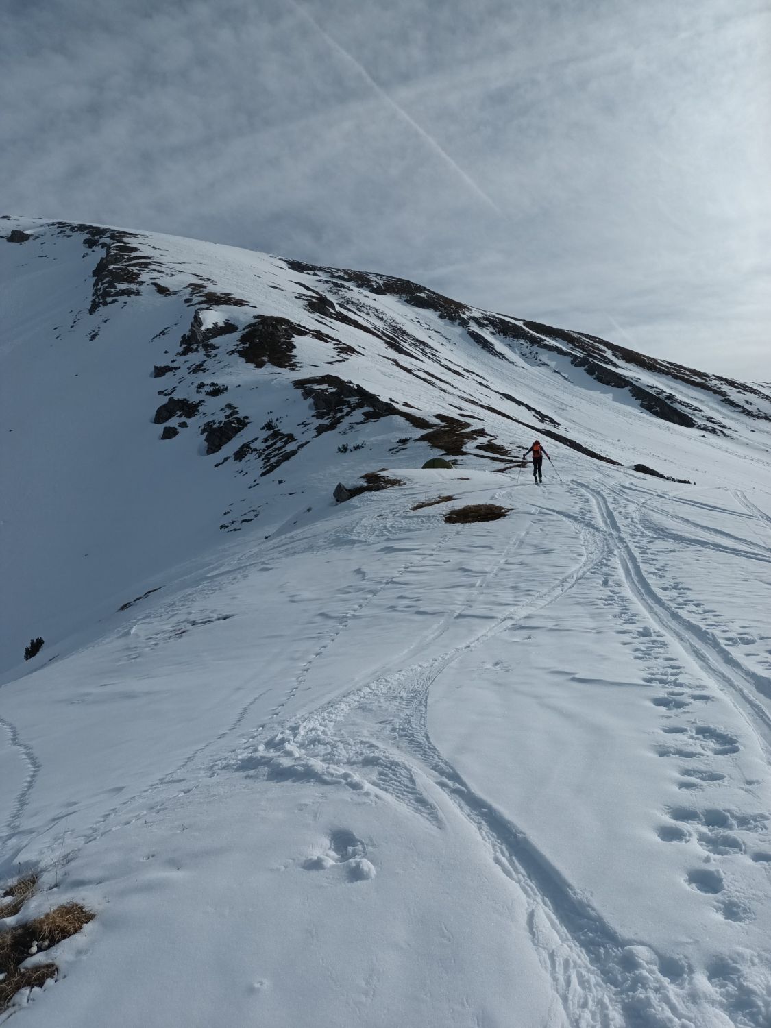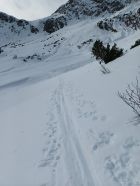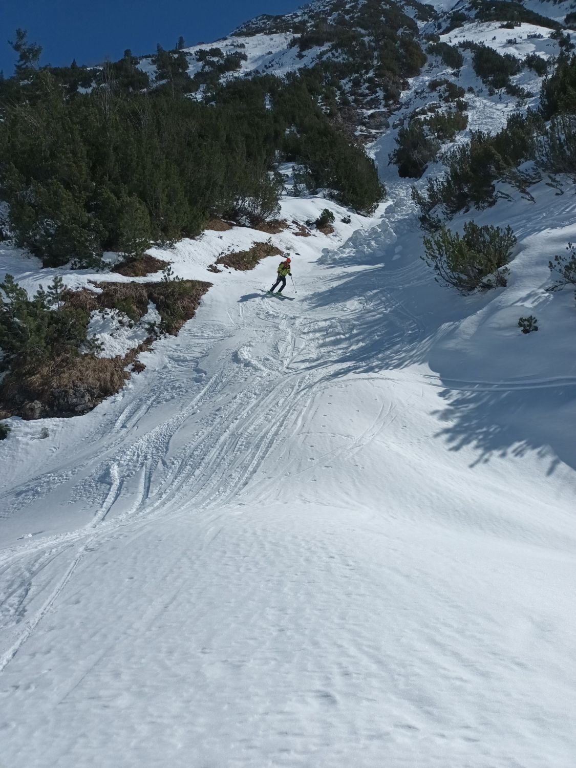 Ab PP bis & nach Fallerschein einzelbe Tragestellen. Aufstieg auf tragendem, gefrorenen Altschnee, ab Steilstufe bis Gipfel mit Harscheisen. Ein größerer Lawinenkegel ist zu queren (problemlos) Abfahrt größtenteils auf aufgefirntem Schnee, vereinzelt stellenweise auch leichter Bruchharsch. Abfahrt rechte Bachseite ist besser