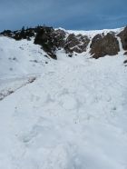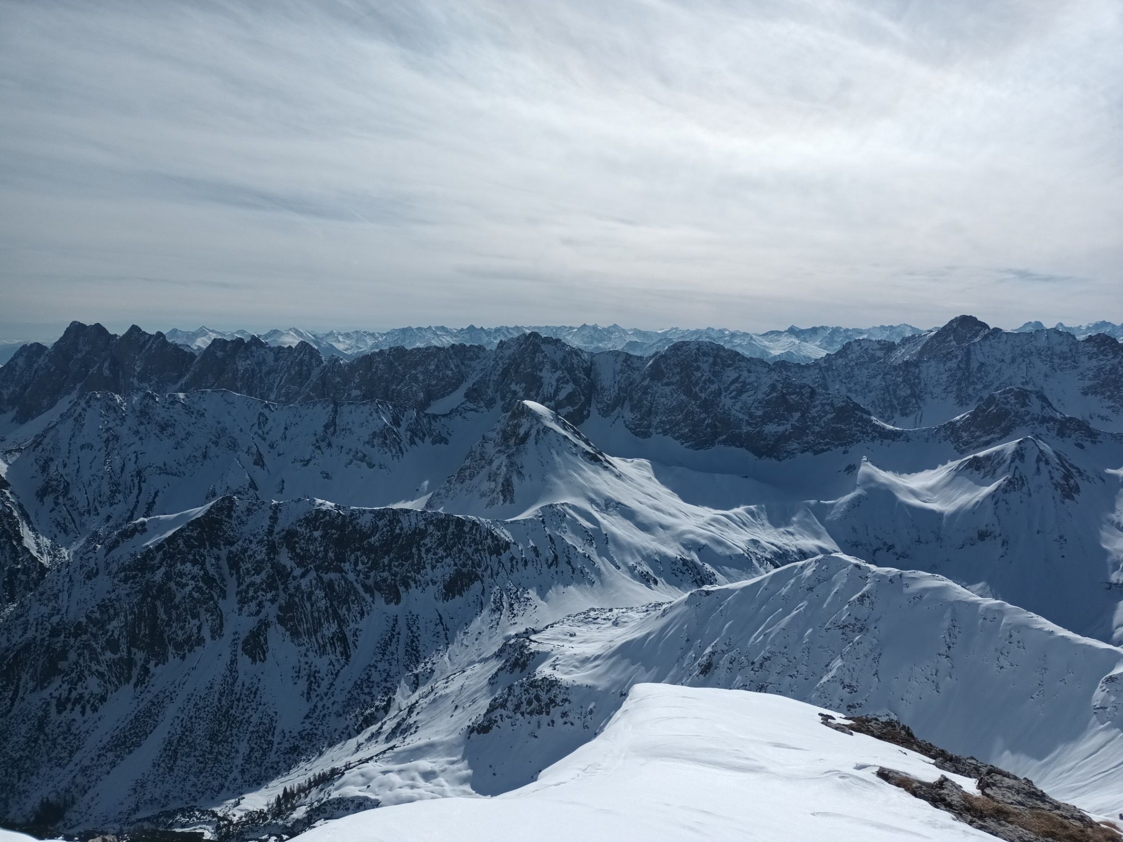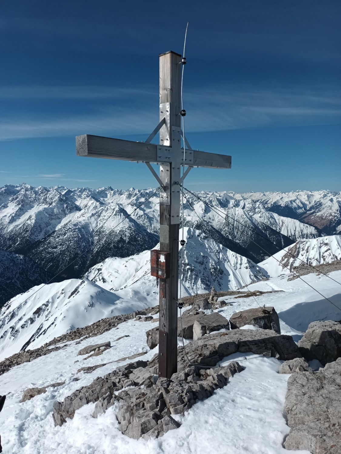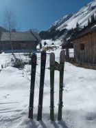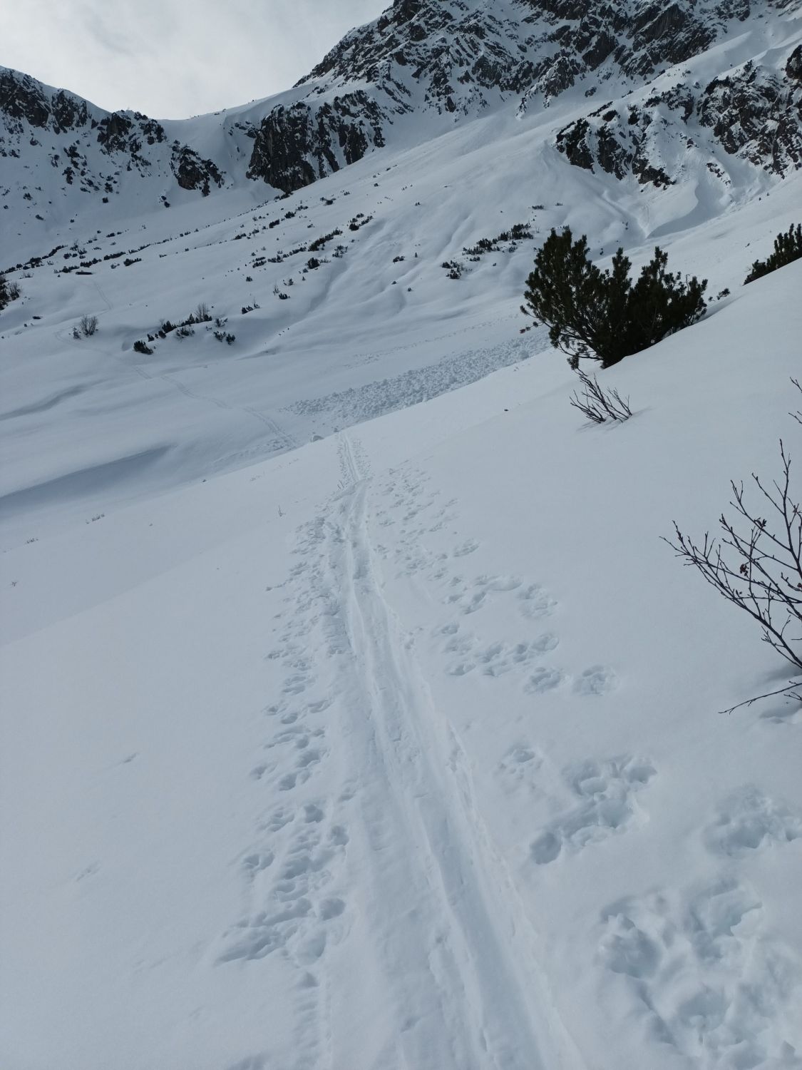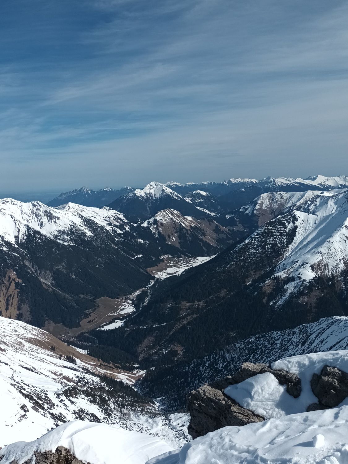 Ab PP bis & nach Fallerschein einzelbe Tragestellen. Aufstieg auf tragendem, gefrorenen Altschnee, ab Steilstufe bis Gipfel mit Harscheisen. Ein größerer Lawinenkegel ist zu queren (problemlos) Abfahrt größtenteils auf aufgefirntem Schnee, vereinzelt stellenweise auch leichter Bruchharsch. Abfahrt rechte Bachseite ist besser