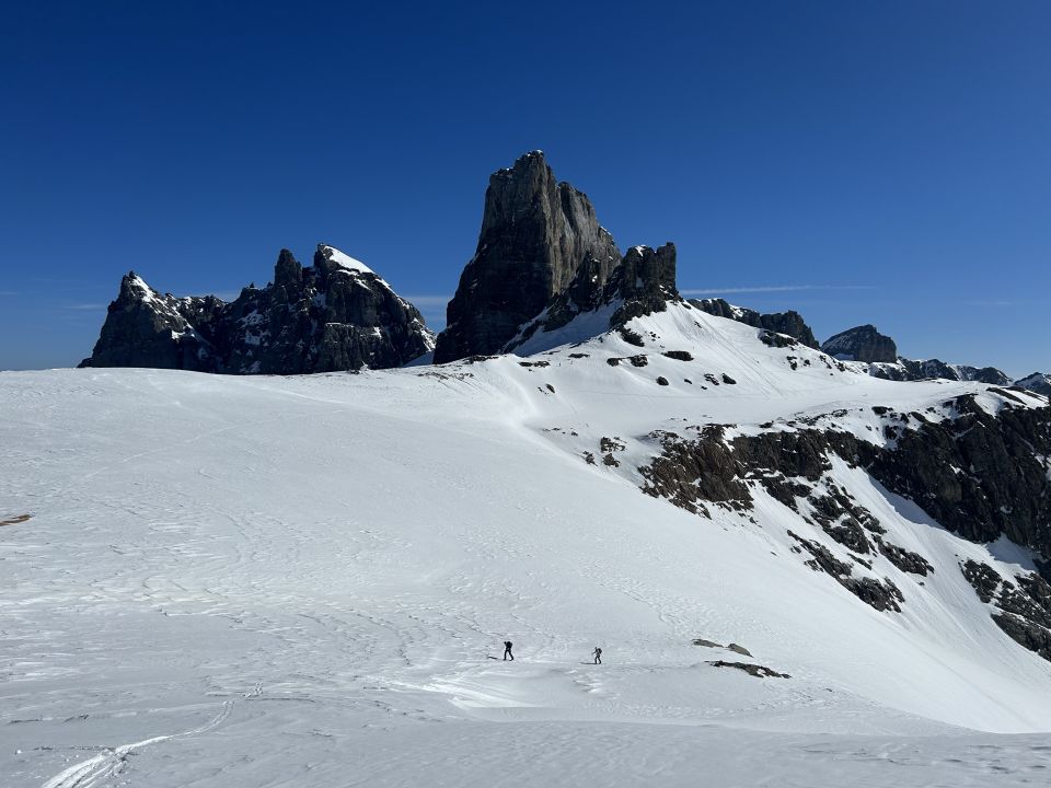 Abfahrt sehr gut, oben leicht angesulzt, weiter unten recht feuchter Schnee. Wir fuhren noch vor Mittag durch den Steilhang ab, was sicher eine gute Wahl war. Der Schnee war recht aufgeweicht und feucht. Restliche Abfahrtsstrecke durchgehende Schneedecke, teilweise etwas umsichtige Fahrweise von Nöten, um keine Steine zu erwischen. Auf letztem Abschnitt bremsender Schnee.