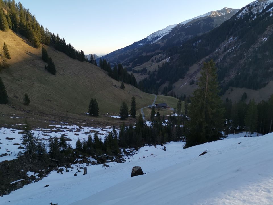 Abfahrt vom Gipfel kurz nach 11 war gut, oben Pulver, ab Bütschi je nach Exposition Sulz, nass oder hart.