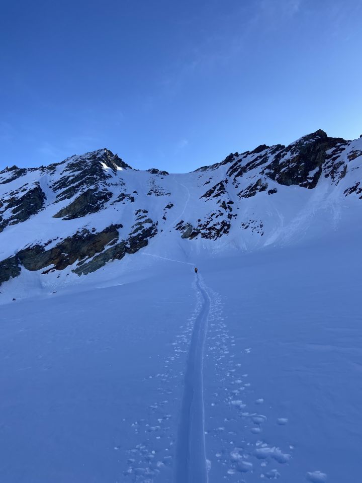 Sämtliche Abschnitte sind aktuell gut zu gehen und fahren. An mehreren Stellen ist Aufmerksamkeit betreffend Gletscherspalten unerlässlich. Der Aufstieg zum Col du Mont Brulé mit festem Trittschnee. Herrliche Abfahrt vom Col de Valpelline. Entlang dem Zmuttgletscher hat es eine noch knapp geschlossene Schneedecke mit zahlreichen Schiebepassagen.