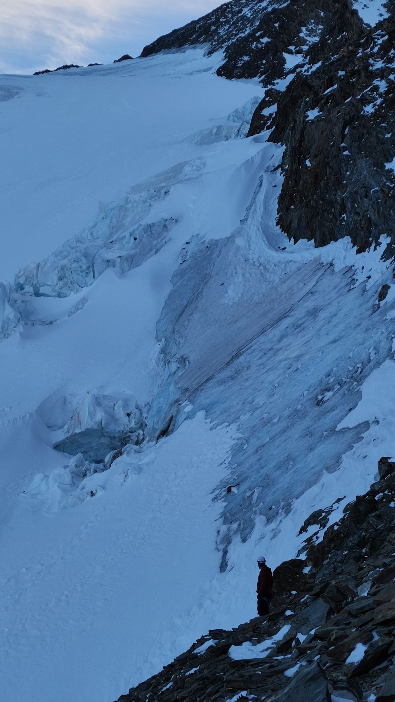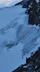 Übergang Frühstücksplatz problemlos. Aber gleich neben der Spur Blankeis. Dann gut zu steigen auf hart gepresstem Schnee. Oberer Teil zum Hugisattel gerade noch mit Harscheisen machbar. Wir konnten uns im Aufstieg ganz rechts noch auf einem schmalen Altschneeband durchschummeln. Daneben blankes Eis.