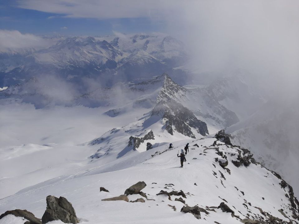 Skispur Richtung Gipfel über den Brunnifirn ist gelegt. Für den Gipfelaufschwung gibt es eine gute Trittspur bis hoch zum Gipfel. Abfahrt vom Gipfel zum Brunnifirn ist machbar, aber die untere Passage ist wegen dem wenigen Schnee ziemlich eng und man kommt nur mühsam runter, mit den kürzeren Snowboards ist es weitaus einfacher. Nur für sehr gute Fahrer zum empfehlen, da sehr steil – No Fall Area. Abfahrt über den Brunnifirn bis runter auf die Fläche.