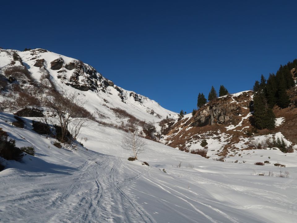 Ausser einer halben Stunde Skitragen am Anfang eine perfekte Frühlingsskitour mit Sulzschnee vom Feinsten (Abfahrt 11.30 Uhr), im Schatten des Schwarzhorns sogar noch Pulverschnee, am Gipfelhang kann bis halbe Höhe mit den Skiern aufgestiegen werden, dann zu Fuss nach rechts und den Rest über den Wanderweg.