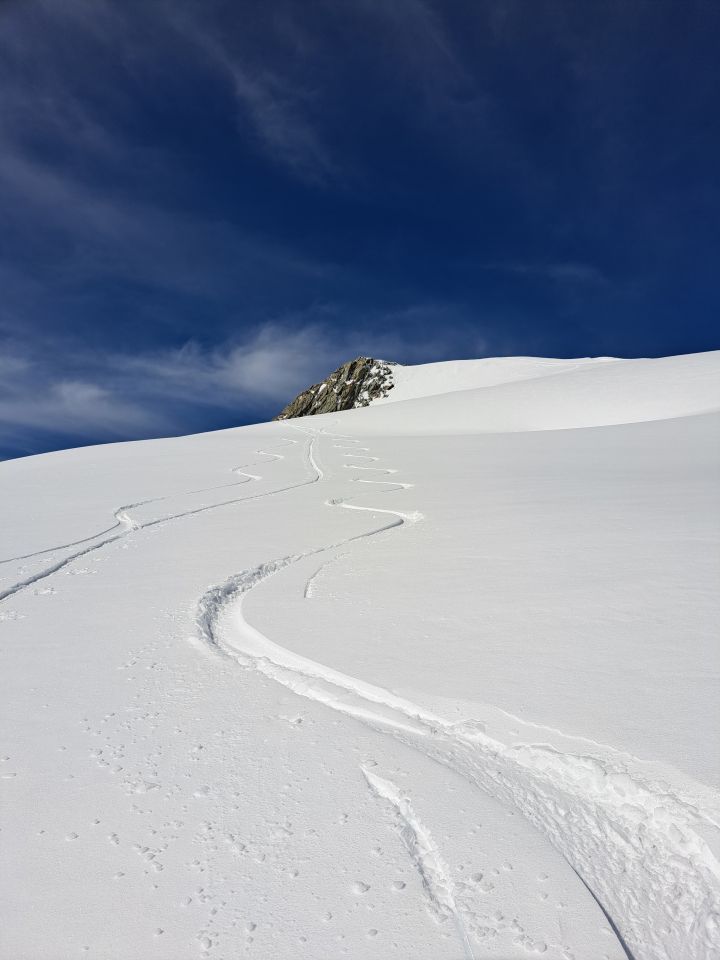 Auf dieser Tour sind die Spalten gut eingeschneit. Wir konnten vom Klettersteig bis auf den Gipfel alles mit den Skis laufen, Harscheisen waren hilfreich. Wohl eine der Lohnenswertesten Skitouren im Gebiet.