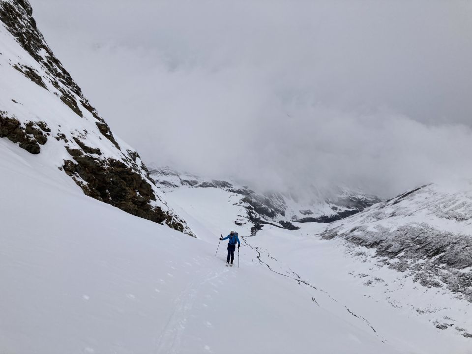 Im Rotmoostal teilweise in Schnee eingebrochen. Restes steileres Stück ohne Harscheisen etwas mühsam da nur ca. 5 Neuschnee auf harter Unterlage. Rest einfach und oben ca 10cm Pulverschnee. Kletterstelle auf Joch Problemlos. Rücken auf den Gipfel abgeblasen. Erste Meter ostseitige Abfahrt eisig.