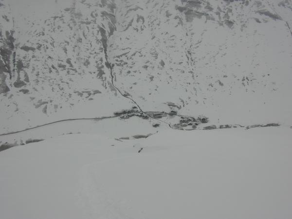 Leider trafen wir keine Frühlingsverhältnisse an. Die Temperatur lag unter 0°C, die Schneedecke war Kompakt und mit 10cm Pulverschnee bedeckt. Im oberen Teil erschwerten rutschige Schneeschichten das flüssige vorwärtskommen uns Schneeschuhgänger. Die Abfahrt erfolgte bei schlechter Sicht und leichtem Schneefall. Das steile Gelände war mit der griffigen Unterlage gut zu fahren.