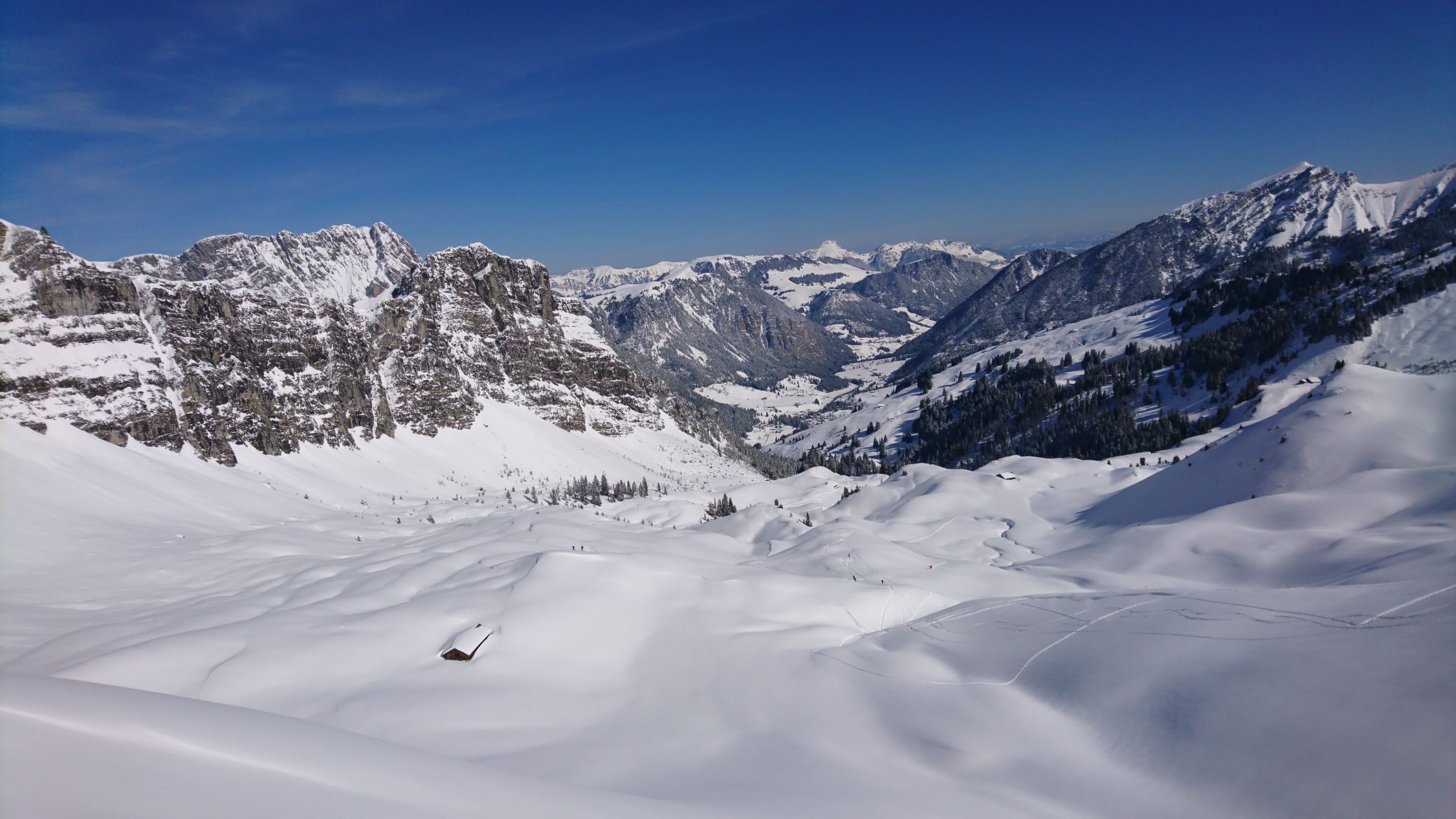 Mit dem Neuschnee waren die Verhältnisse sehr gut. Ganz unten gab es nur diesen neuen Schnee. Zuerst in Richtung Färmel abgefahren und dann wieder Richtung Grimmialp zurück.