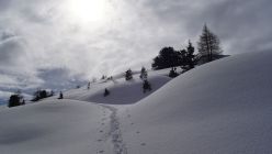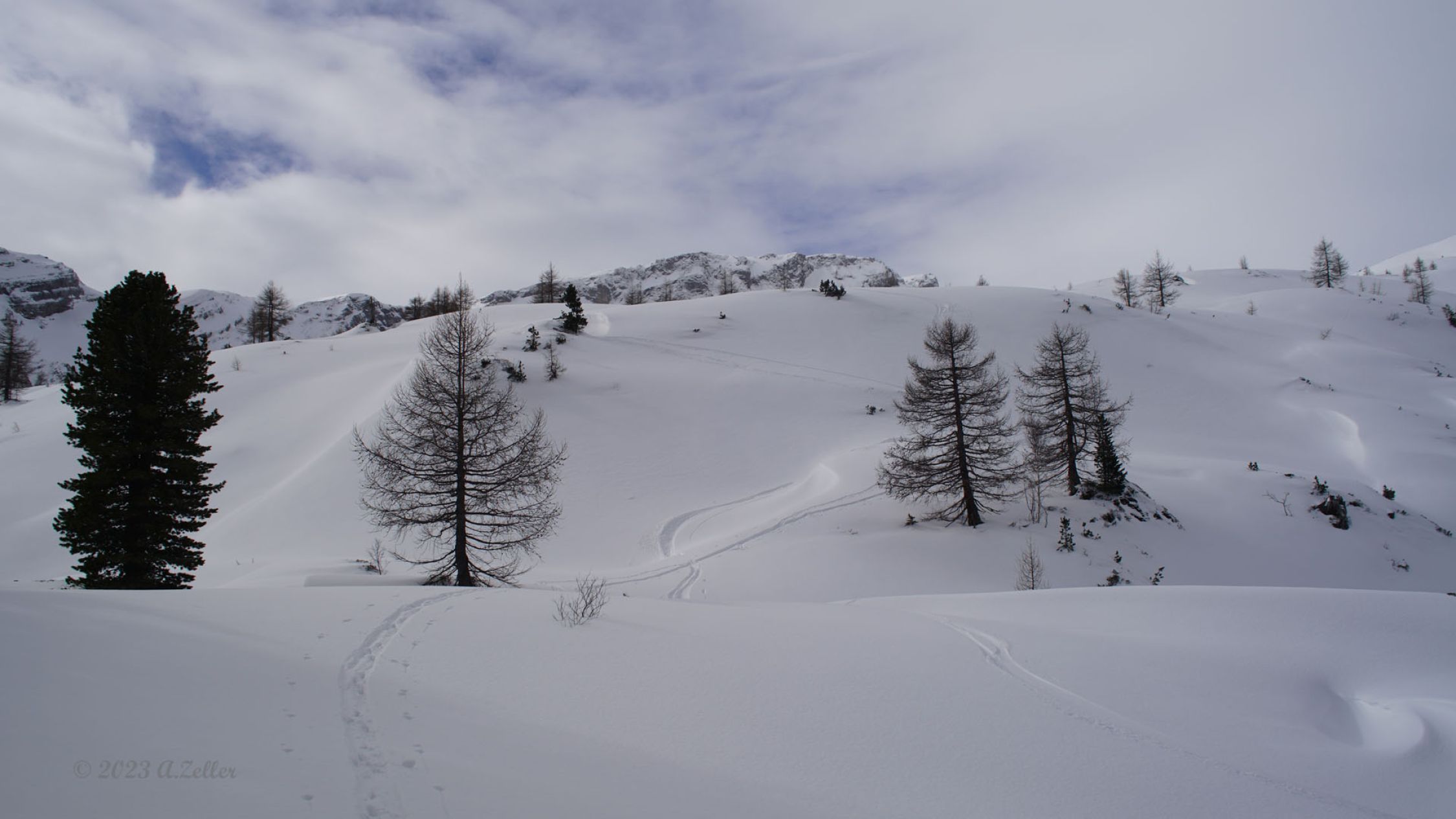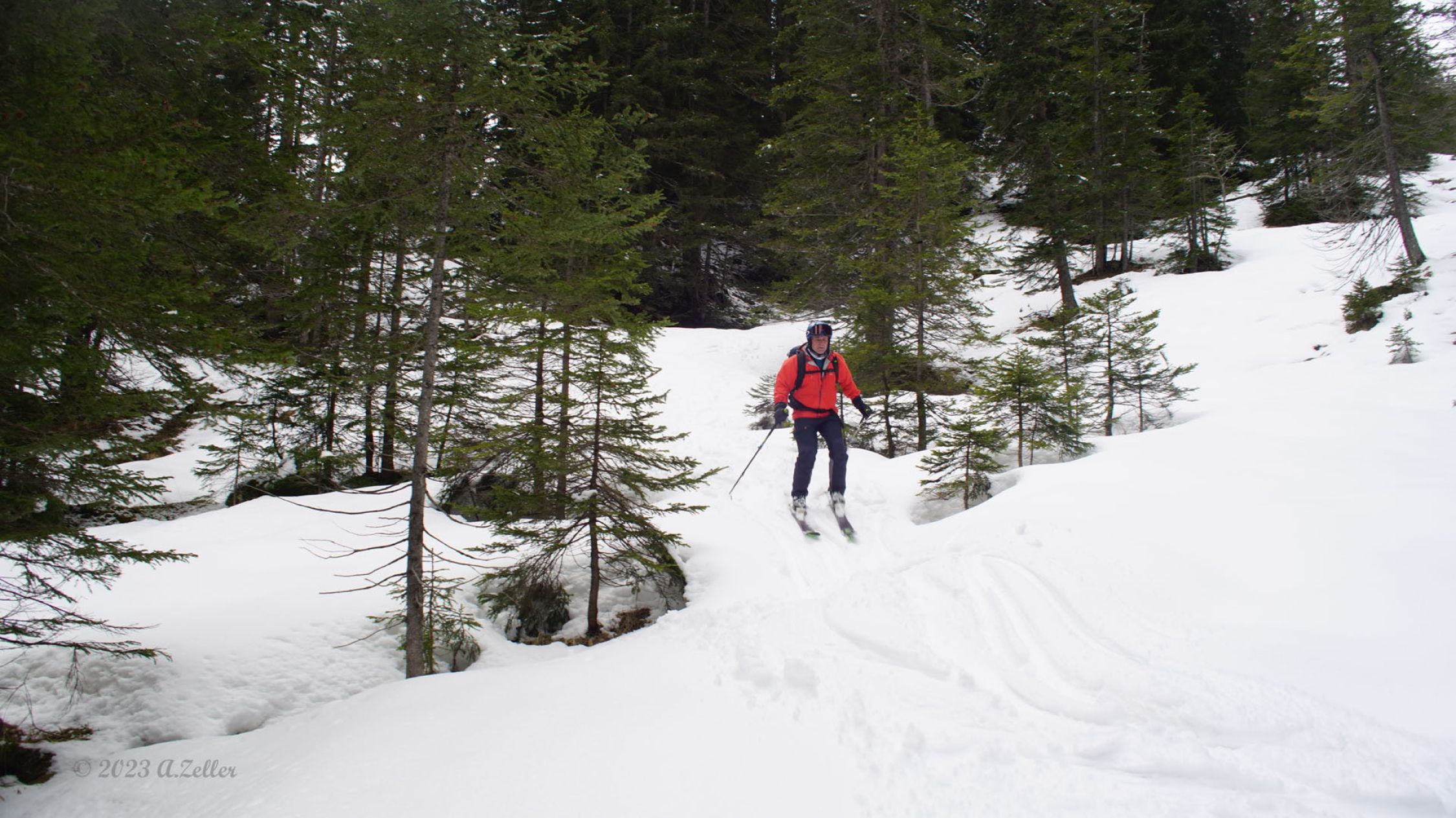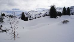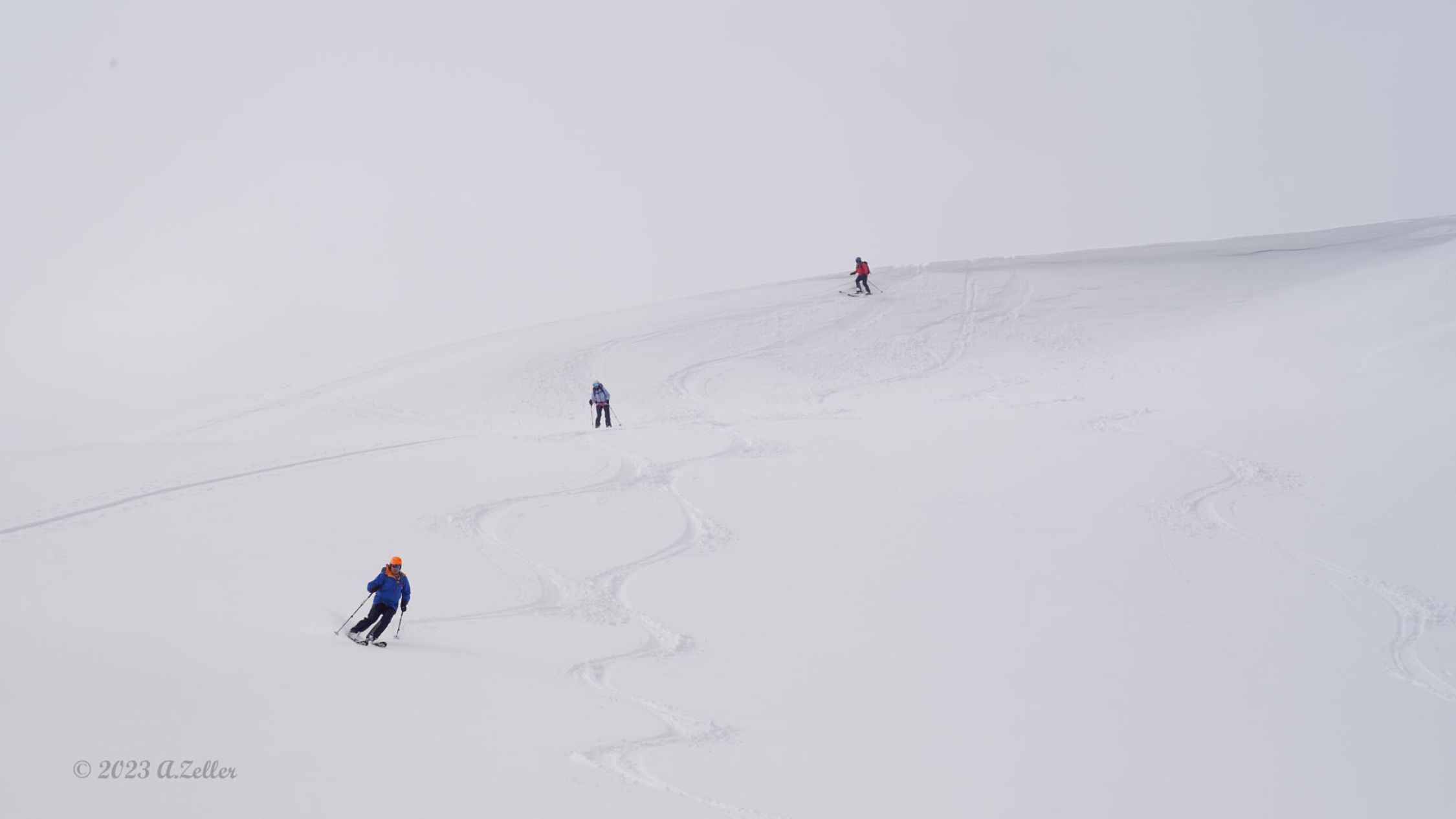 Abfahrt: Wunderbare Hänge praktisch unverfahren bis Lindi Chäle, weiter talwärts nass. Abfahrt von Lischböde dem Schneeschuhtrail entlang dem Artiggräbli lohnt sich nur bedingt, ab 1450m müssen Skis getragen werden.