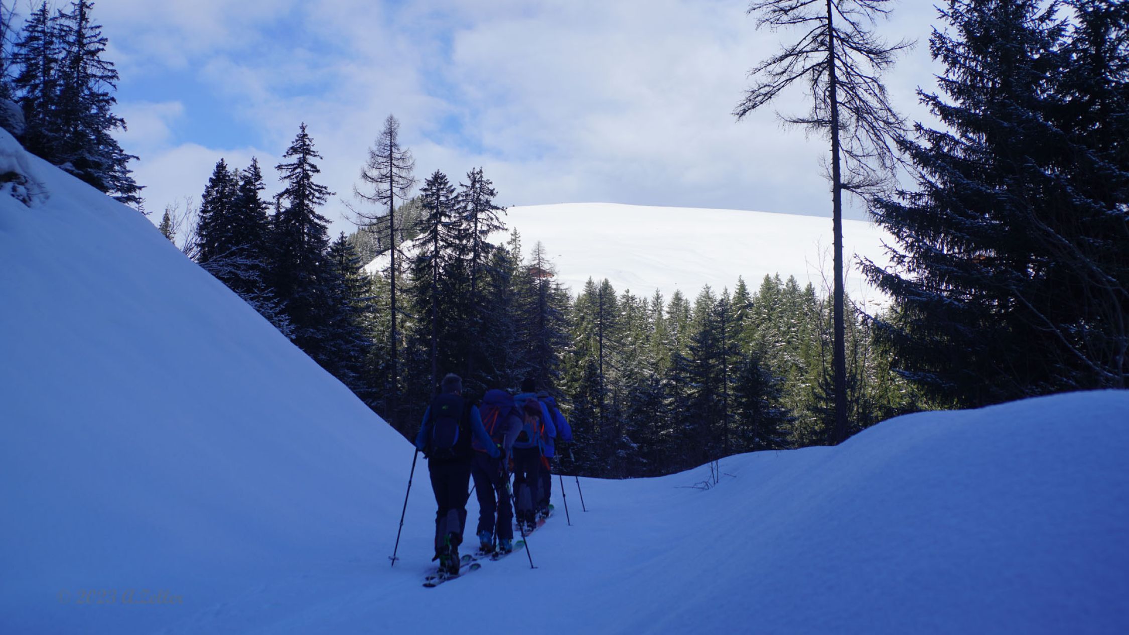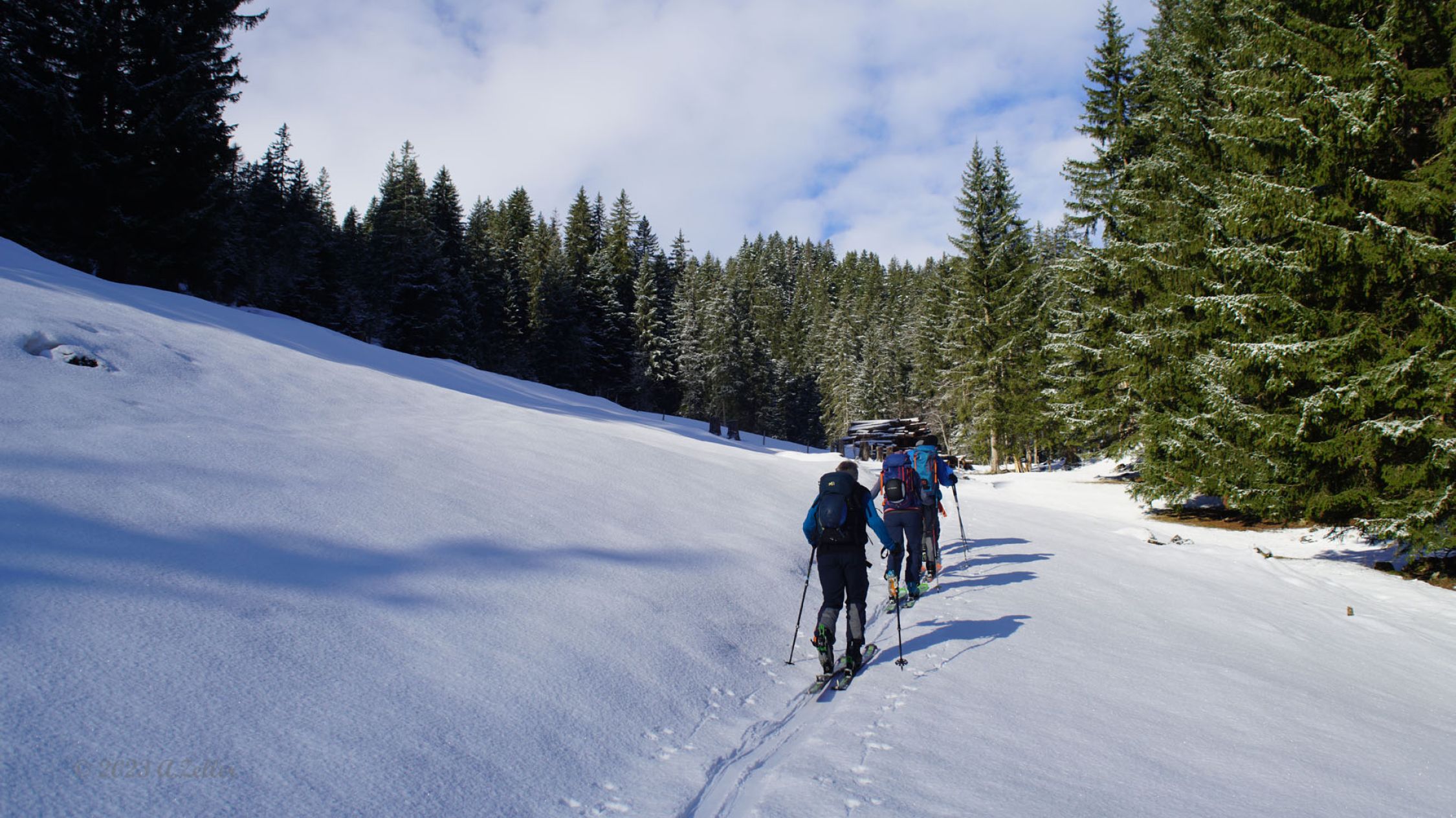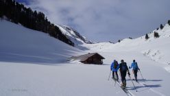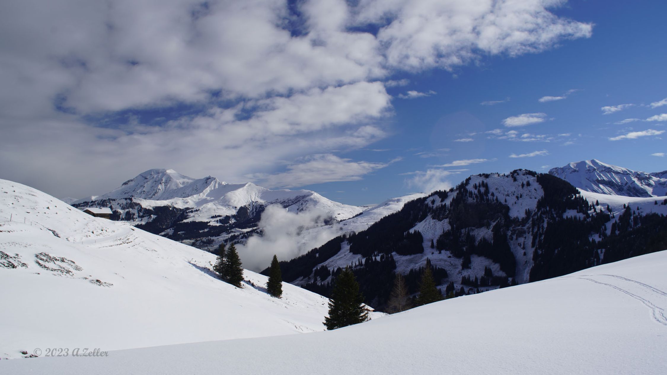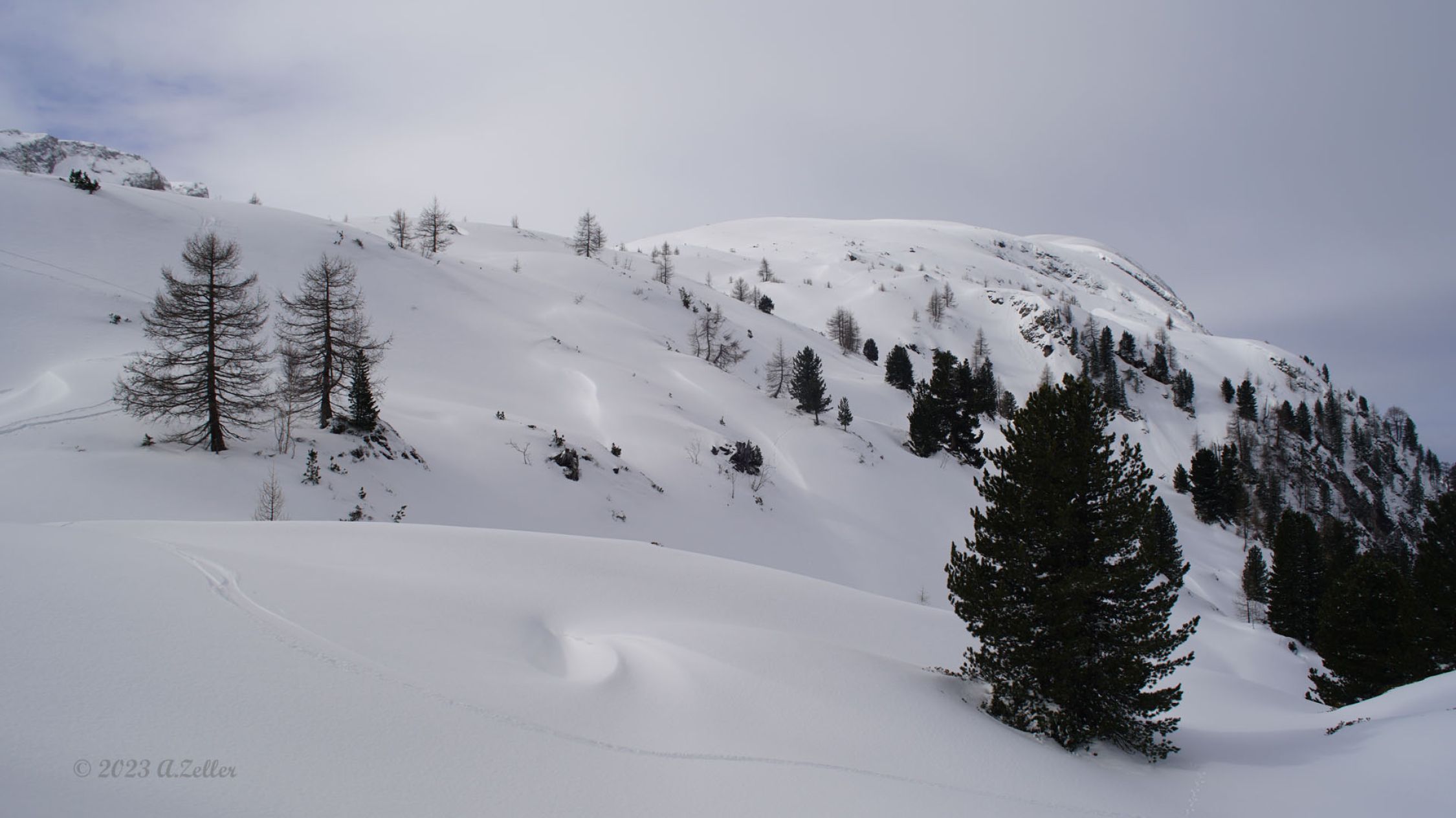 Abfahrt: Wunderbare Hänge praktisch unverfahren bis Lindi Chäle, weiter talwärts nass. Abfahrt von Lischböde dem Schneeschuhtrail entlang dem Artiggräbli lohnt sich nur bedingt, ab 1450m müssen Skis getragen werden.