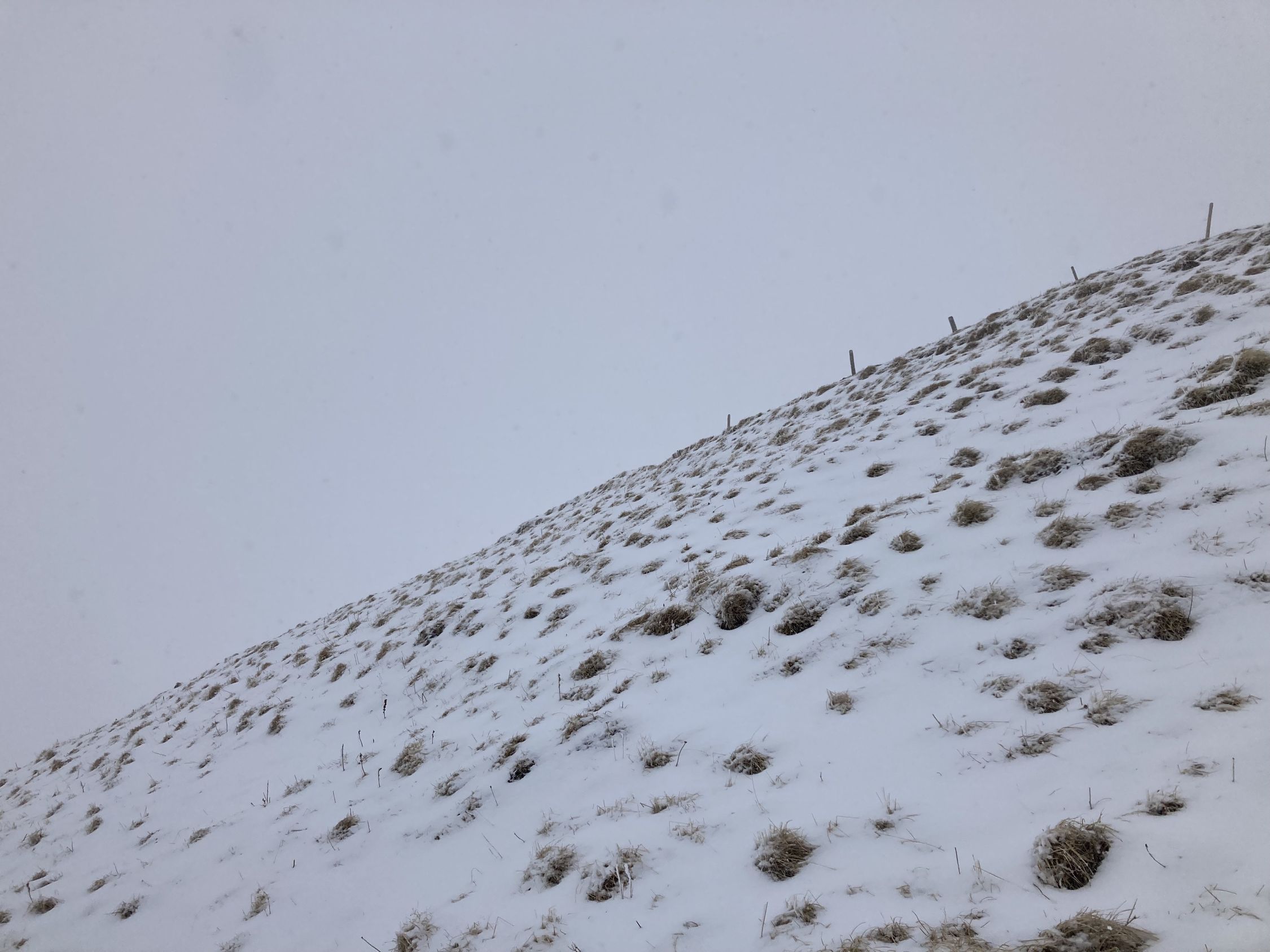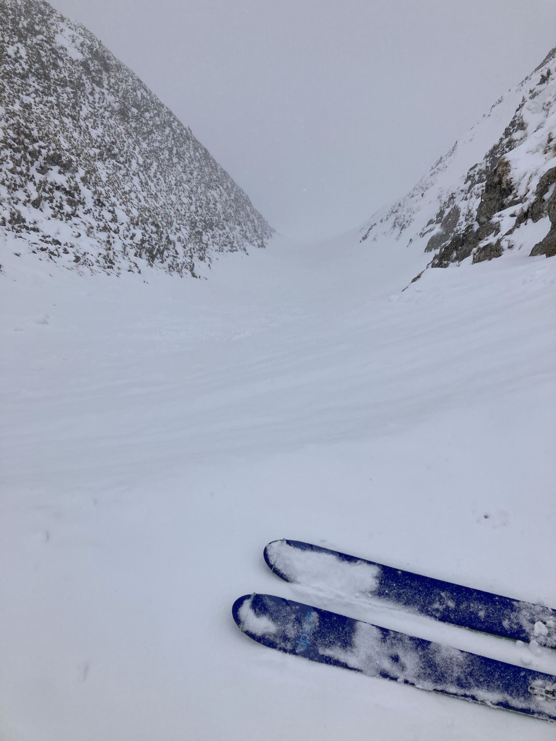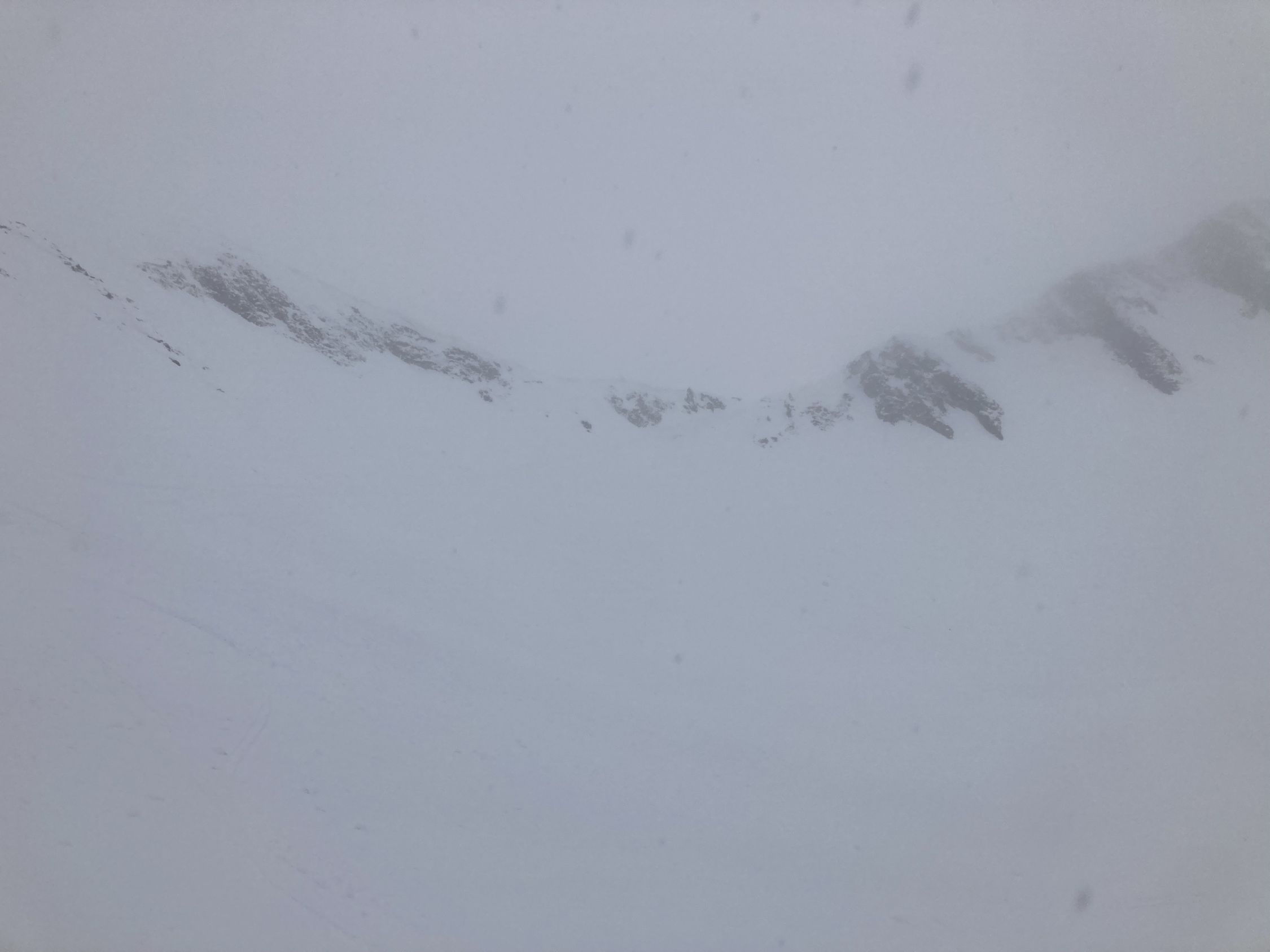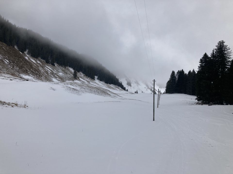 Beim Start um ca 13:30 Uhr 2 Grad und leichter Schneefall. Die Sicht war erstaunlich gut. Später konnte ich von der Chummlihütte den Morgete erkennen (ging mir schon anders die Saison). Es hatte ein kleines Schümli auf tragender, nasser Unterlage. Ab der Morgete waren es zwei-drei Centimeter mehr. Ich bin direkt in der Südostflanke hoch und dann zum südlicheren Ostculli gequert. Es hatte kaum Schnee in der Flanke und auch im Culli mehrheitlich gesetzter, nasser, älterer Schnee, mit einem kleinen Topping. Das kam dann auch als sluff.