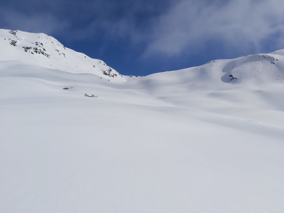 Waren zum Isenfürggli und nicht Gipfel, dafür zusätzlich mit Pulverschneeabfahrt nordseitig (ca. 200hm), Genügend Schnee ab Start, Schnee gefroren und tragend, heute ein paar cm Pulverauflage. Alle Touren ab Tschuggen recht gute Verhältnisse, Passstrasse noch mit Schnee ab Barriere.