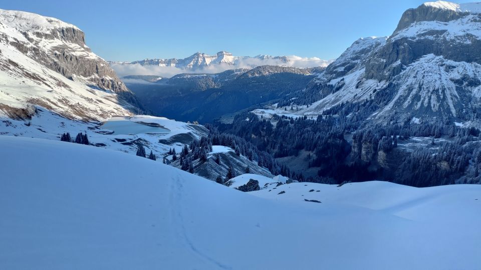 Schneelage im Aufstieg: Ab dem Parkplatz kann/muss man bis etwa 1.300m laufen, erst auf der Strasse, dann auf dem östlichen Weg. Es lohnt also, die Trailrunner mitzunehmen. Den westlicheren Weg durch den Wald würde ich nicht empfehlen, da hat es viele Stücken ohne Schnee. Ab der Gross Gade gute bis ausgezeichnete Schneeverhältnisse - tragender Deckel mit Schümli, und auch genug Unterlage. Ich bin allerdings nur bis zur Traverse knapp unter 2.000m gegangen, diese war mir heute ganz alleine auf weiter Flur zu heikel (siehe auch Abschnitt Lawinenlage).