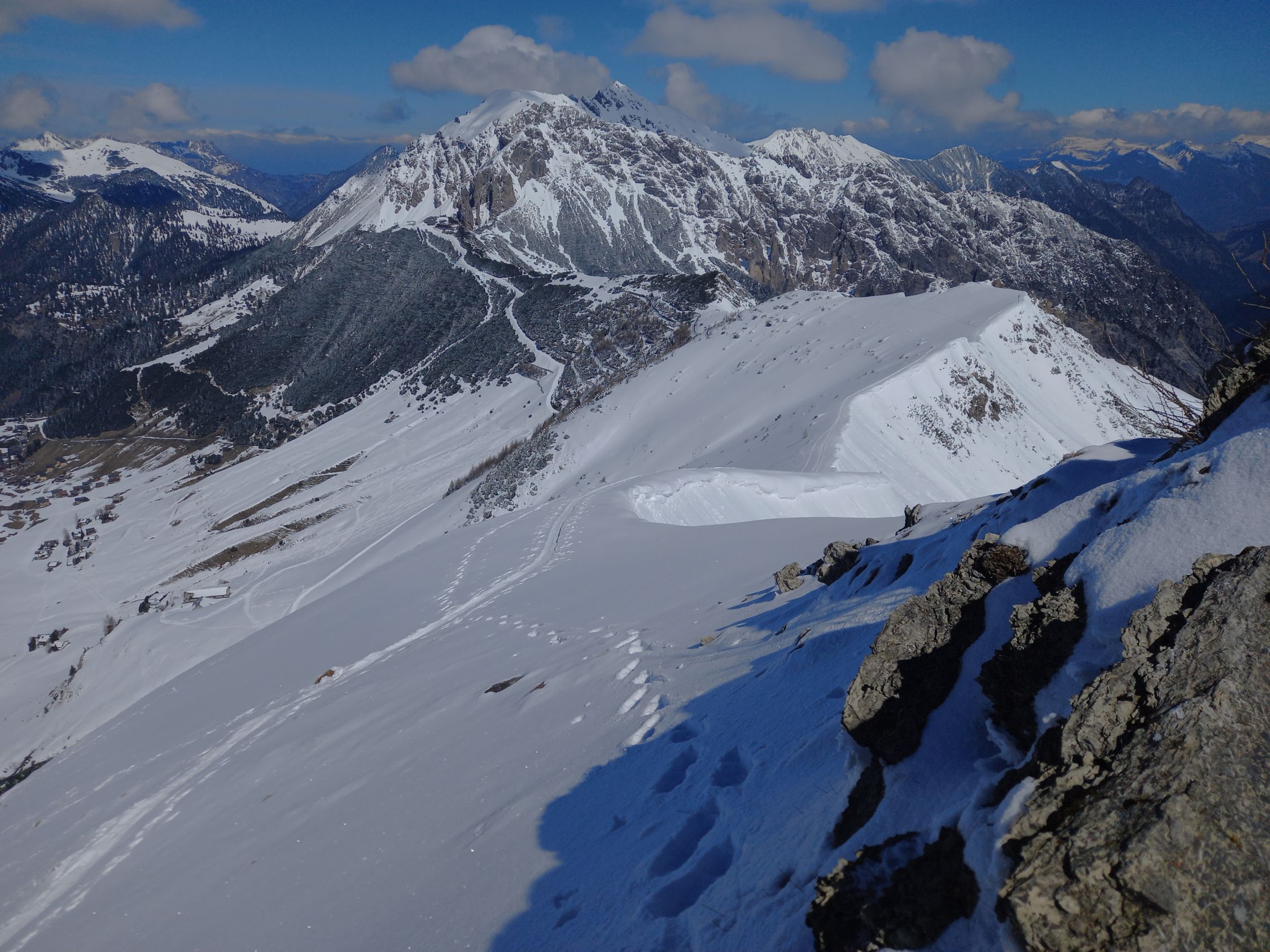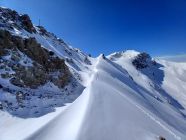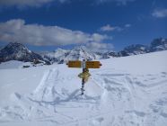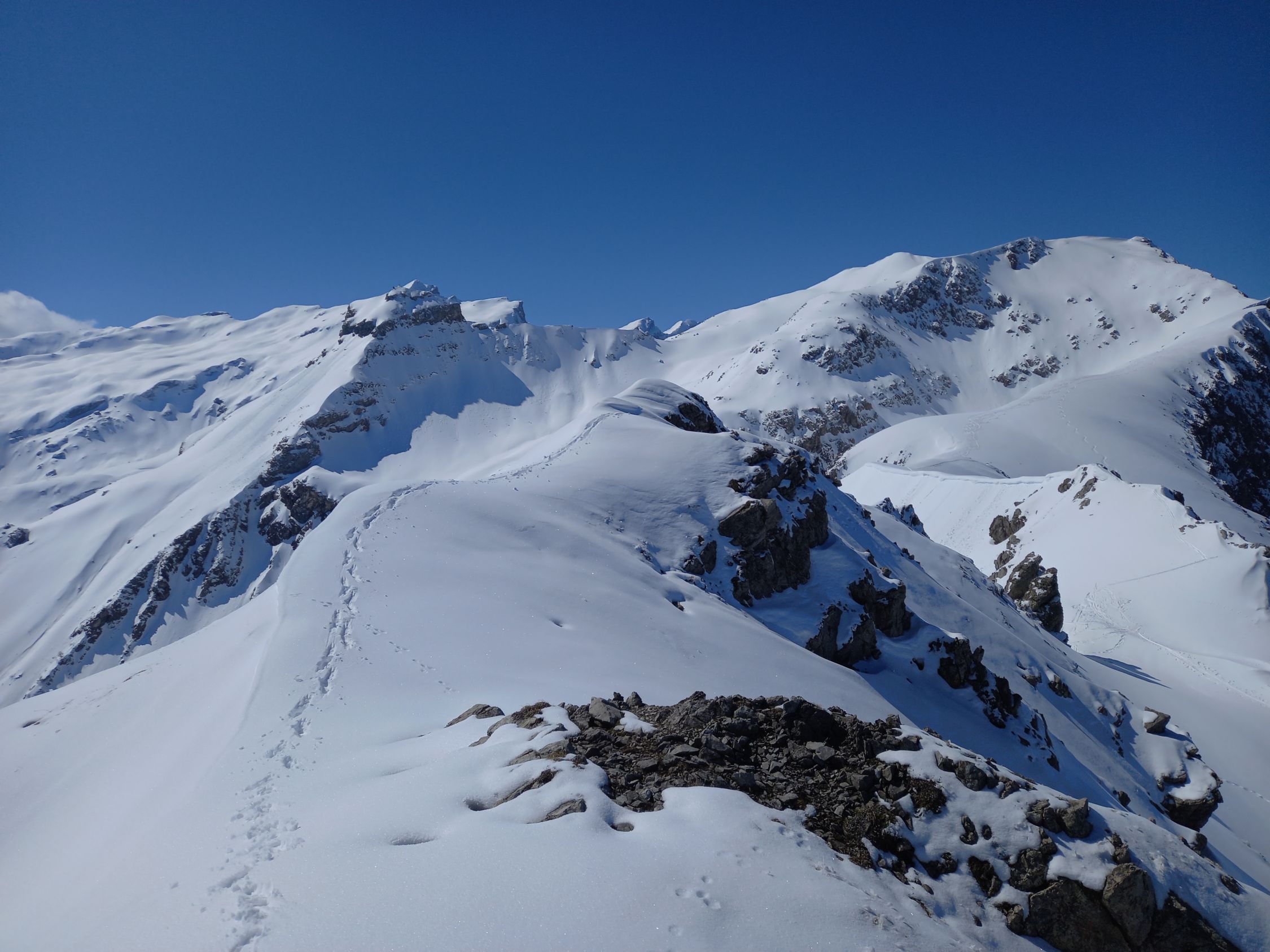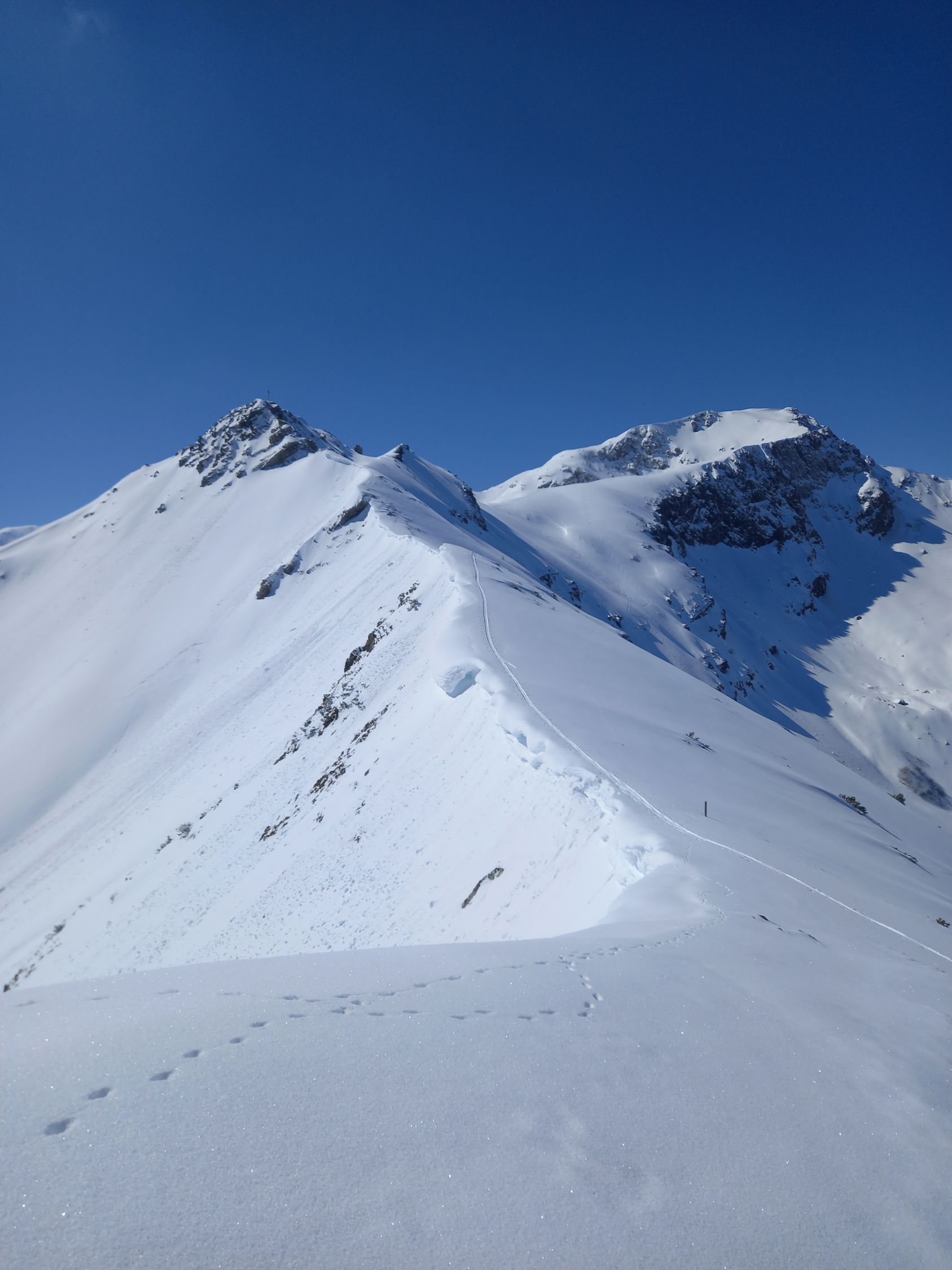 Start um 9:50 in Malbun Jöraboda ohne Schneeschuhe. Beim Kirchle der Fahrstrasse/Schlittelpiste entlang bis zur Abzweigung Fürstin-Gina-Weg: im unteren Teil bereits apere Stellen, oben immer noch mit regulär Schnee, gut zu gehen mit Schneeeketten. Fürstin-Gina-Weg ebenfalls gut ohne Schneeschuhe, da Schneeschuhspuren und morgens noch hart . Beim Kreuz hat yours truly für den Grat auf die "richtigen" Steigeisen gewechselt. Obacht: der Grat ist stark verwechtet, aber gut zu gehen, da Pulver auf harter Unterlage. Spitz durch eines der Couloirs direkt besteigen, harte Kruste tragend. Rückweg gleich wie Aufstieg.