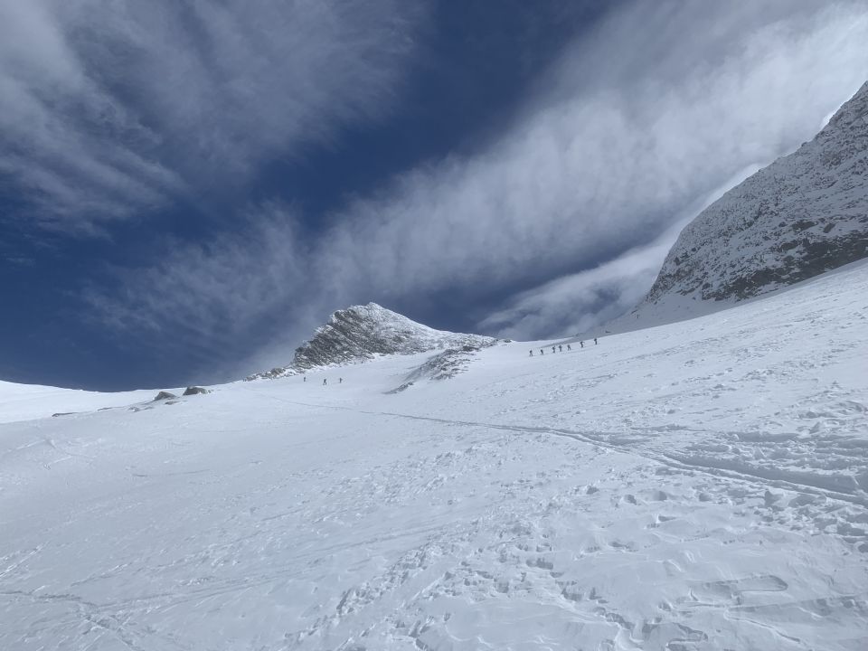 Die Aufstiegspuren sind gut. Der letzte Teil zum Pass ist vereist und kann noch knapp an der linken Seite mit den Skiern begangen werden. Der Gipfel ist abgeblasen und sollte nur mit Harscheinsen oder Steigeisen begangen werden