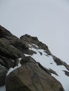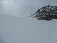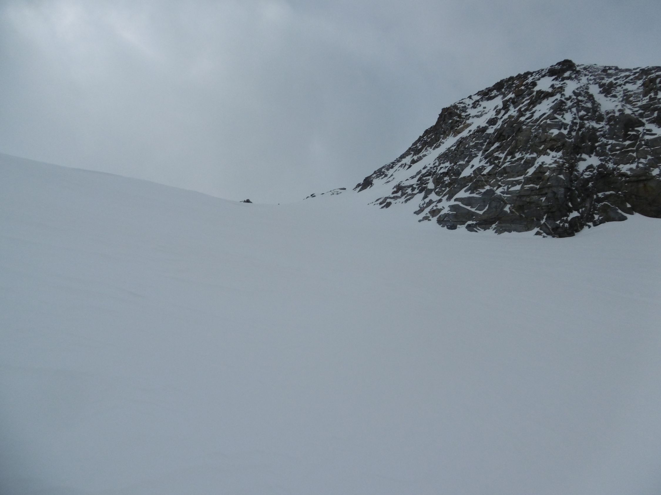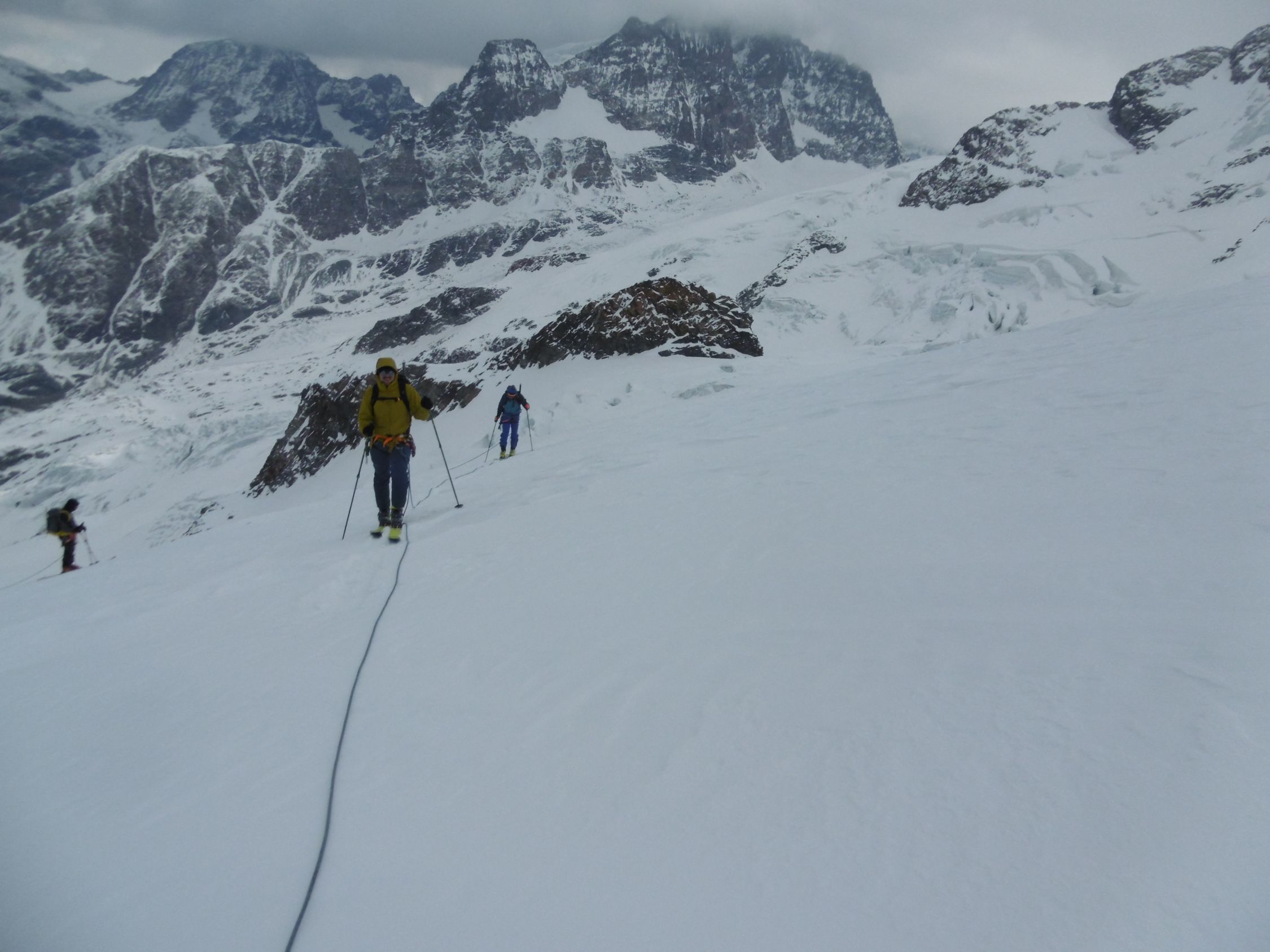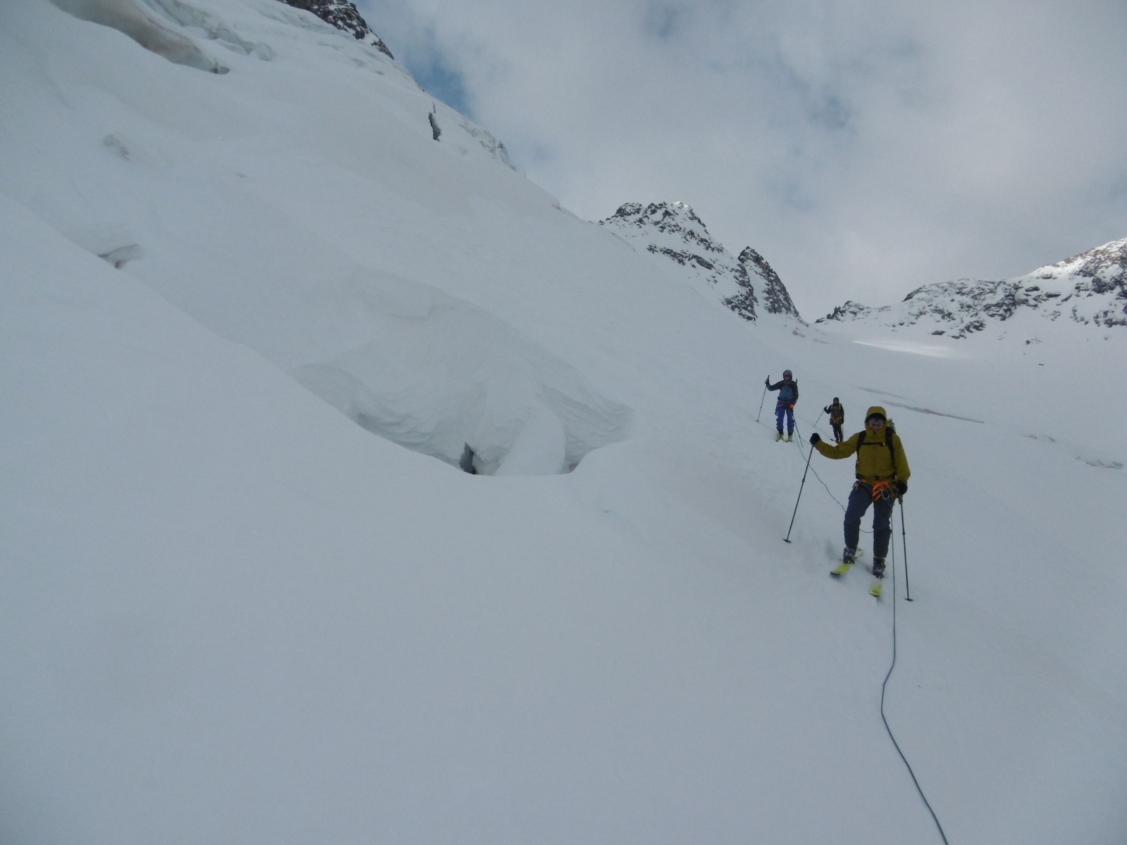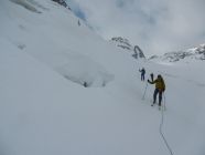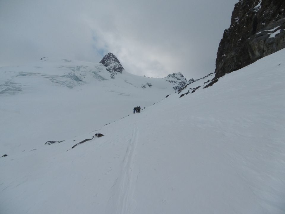 Bis ca 3050m auf Gletscher unproblematisch, dann angeseilt (und Harscheisen) vor Gletscherbruch-Durchgang auf ca 3100m, weiterhin sensible Spaltensituation bis Sattel auf ca 3380m, 4 Std von der Hütte.