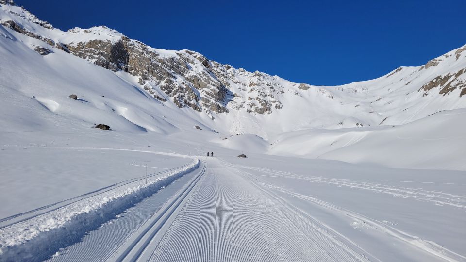 Angesichts dieses bescheidenen Winters ein Highlight. Überall genug Schnee und kein Steinkontakt, ausser dem Gipfelaufschwung zum Grossstrubel, aber der ist immer verblasen. Abfahrt vom Grossstrubel bis Frühstücksplatz überwiegend gepresster Schnee, teilweise schwerer Pulver, aber alles gut zu fahren. Ab Frühstücksplatz wurde es dann richtig gut. Durchgehend Pulver bis fast ins Skigebiet. Der Aufstieg zum Frühstücksplatz ist jetzt sehr gut eingespurt (Danke an den Bergführer und den nachfolgenden Tourengänger) und bis zwei Meter unter die Wächte mit Ski begehbar.