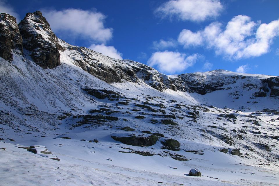 Hüttenweg aper, ab 2200m geschlossene Schneedecke. Auf der ganzen Gipfelflanke habe ich guten Trittschnee vorgefunden. Für die Steilrinne auf 2560m sind Steigeisen und Pickel notwendig. Die Route ist mit einigen Steinmännchen und blau-weissen Markierungen seit einigen Jahren markiert, allerdings sind bei dem Schnee die MArkierungen nicht überall sichtbar.