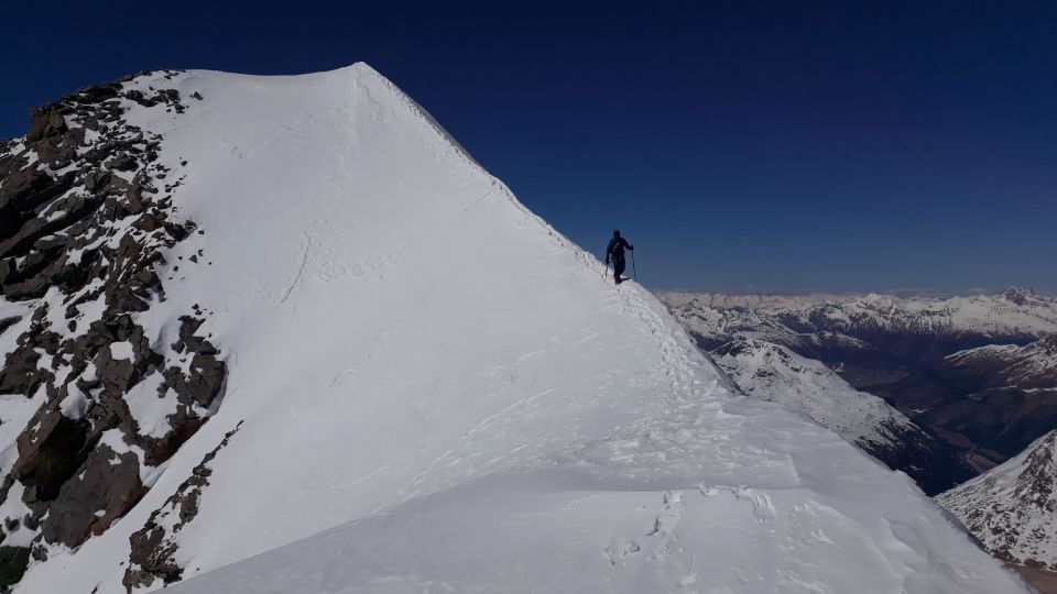 Wir dachten an die „Weiße Hölle vom Piz Palü“ als wir um 8.00 Uhr morgens zusammen mit einem ganzen Filmteam in der ersten Bahn auf die Diavolezza fuhren. Der strahlendblaue Himmel legte aber eher den Titel „Licht und Schatten am Piz Palü“ nahe. Ausser uns Zweien gab es nur noch Einen, der auch auf den Palü wollte, und so bildeten wir spontan ein Dreierteam. Die steile 200-Hm-Abfahrt hinunter zum Persgletscher erfolgte in knüppelhartem Schnee und zeigte die Schneearmut dieses Winters. Zwischen vielen Felsinseln hindurch war es schwer, ohne Unterbrechung einen Weg zu finden. In 2700 m Höhe trafen wir auf den Gletscher. Zunächst verfolgten wir eine frische Spur, die vom Morteratschgletscher kommend hochzog. Kurz unter den ersten Eisbrüchen (Cambrena-Brüche) kamen uns zu dieser frühen Tageszeit zwei Skifahrer ohne großes Gepäck von oben entgegen, die in einiger Entfernung von uns abwärtsfuhren. Wir vermuteten später, dass es Diavolezzabahn-Bedienstete waren, die den Weg begutachteten. Am oberen Ende des charakteristischen Links-Rechts-Durchstiegs der ersten Bruchzone kam für uns die erste Herausforderung. Eine halbmeterbreite Spalte war zunächst noch mit Schnee bedeckt, der dritte von uns sackte aber bereits trotz Warnung bis zur Hüfte ein (ohne Skier). Von weiter oben konnte man gut den ganzen Verlauf der Spalte erkennen, die über 20 Meter quer zum Weg verlief. Mangels anderer Möglichkeit überfuhren wir sie in der Abfahrt mit Skier knapp links der Stelle, wo wir im Aufstieg eingebrochen waren. Der weitere Aufstieg erfolgte dann problemlos entlang der Aufstiegspur der beiden Skifahrer vorbei an großen Spalten bis zum großen Gletscherbecken. Hier verlor sich die Spur und wir stiegen zunächst flach, dann immer steiler bis zum Beginn der oberen Brüche auf. In einem verwinkelten Weg überwanden wir einigermassen sicher die Brüche. Im Schlusshang vor der Linksquerung hinüber zum Skidepot entdeckten wir dann wieder eine Querspalte, die sich über den ganzen Hang zog. Sie war in diesem pulvergepressten Gelände komplett unsichtbar, aber nur mit nicht tragfähigem Windpulver bedeckt. Wir behielten deshalb auch in der Abfahrt später unsere gegenseitige Seilsicherung bis zum mittleren Gletscherbecken an. Am Skidepot zeigte sich, was sich bereits von unten an den Windfahnen angedeutet hatte. Es gab Wind in Sturmstärke, der einen in Kombination mit der niedrigen Temperatur (ca. minus 20 Grad) in kürzester Zeit extrem auskühlte. An eine Pause am Skidepot war nicht zu denken, wir stiegen nacheinander mit Pickel und Steigeisen den Schlussanstieg entlang von verblasenen, aber trittfesten Spuren hinauf. Zweimal gab es kurze Stellen, die sich in Blankeis umwandeln, aber aktuell noch gut griffig sind. Das Gipfelpanorama war ein Traum, allerdings bei diesen Bedingungen nur ein kurzer. Wir waren froh, bei etwas weniger Wind wieder auf Skiern zu stehen und wie erwähnt am Seil bis zum Gletscherbecken abzufahren. Hier legten wir das Seil ab und fuhren bei perfektem Pulver bis an den Fuss der Cambrena-Brüche, wo wir auf ca. 3000 m Höhe eine lange Querung hinüber zur Fuorcla Trovat machten. Die steile Abfahrt hinein ins Val d’ Arlas erfolgte im Schatten der Nachmittagssonne bei sehr hartem Schnee, weiter unten gab es dann wieder lange Passagen in schönem Pulver.