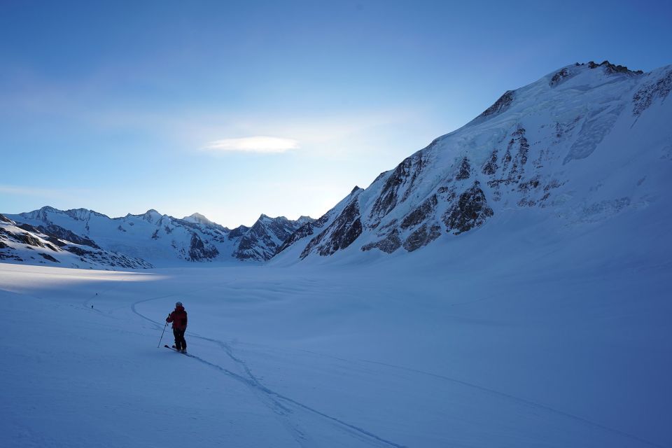 Von der Hollandia Hütte auf den Konkordiaplatz abgefahren, dann über das Ewigschneefeld auf das Unners Mönchsjoch aufgestiegen. Oben recht starker kälter Wind. Abfahrt zur Rippe auf der Hütte steht gut, dort ganz leicht verfestigt Pulver. Wir sind die letzten 50Hm zu Fuss abgestiegen. Hütte war eingeschneit, wir waren alleine und haben die Atmosphäre sehr genossen. Sehr schöne ursprüngliche Hütte.