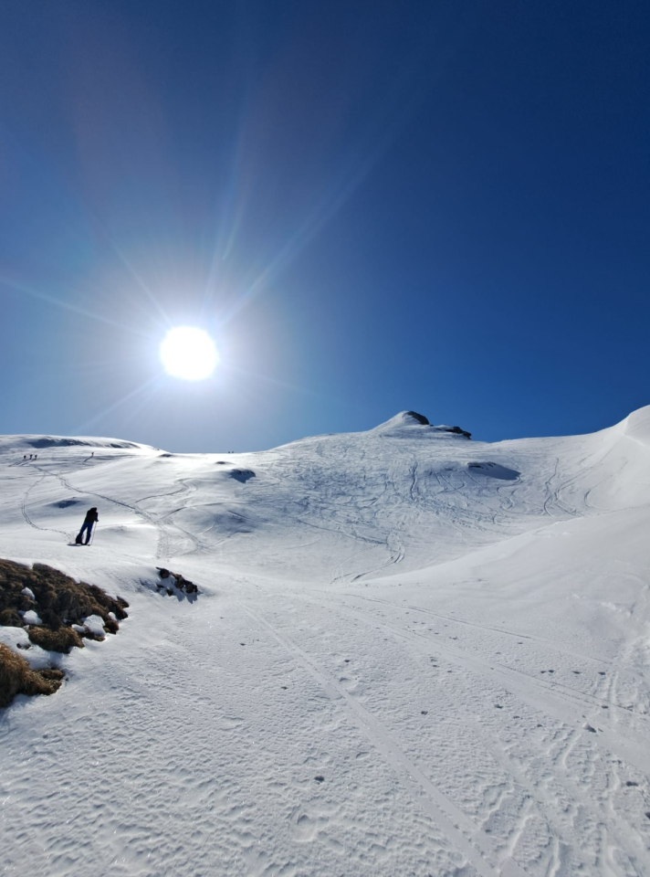 Aufstiegsspur war meist griffig und wir konnten kurz unterhalb des Rossstocks die Skier deponieren und ohne Probleme auf den Gipfel. Gute Tritte.