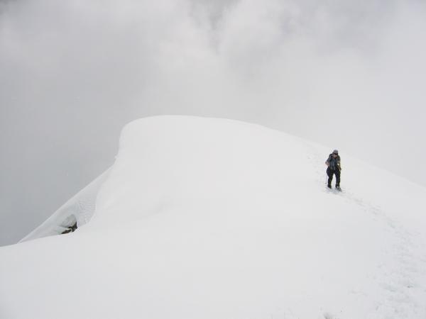 Gefrorene Unterlage mit 15-30cm Neuschnee. Abmarsch bei dichtem Nebel und leichtem Schneefall. Später hat sich der Nebel gelichtet und die dichte Wolkendecke zeitweise aufgerissen. Fernsicht auf Grund der dichten Wolkenfetzen war (leider) äusserst beschränkt.
