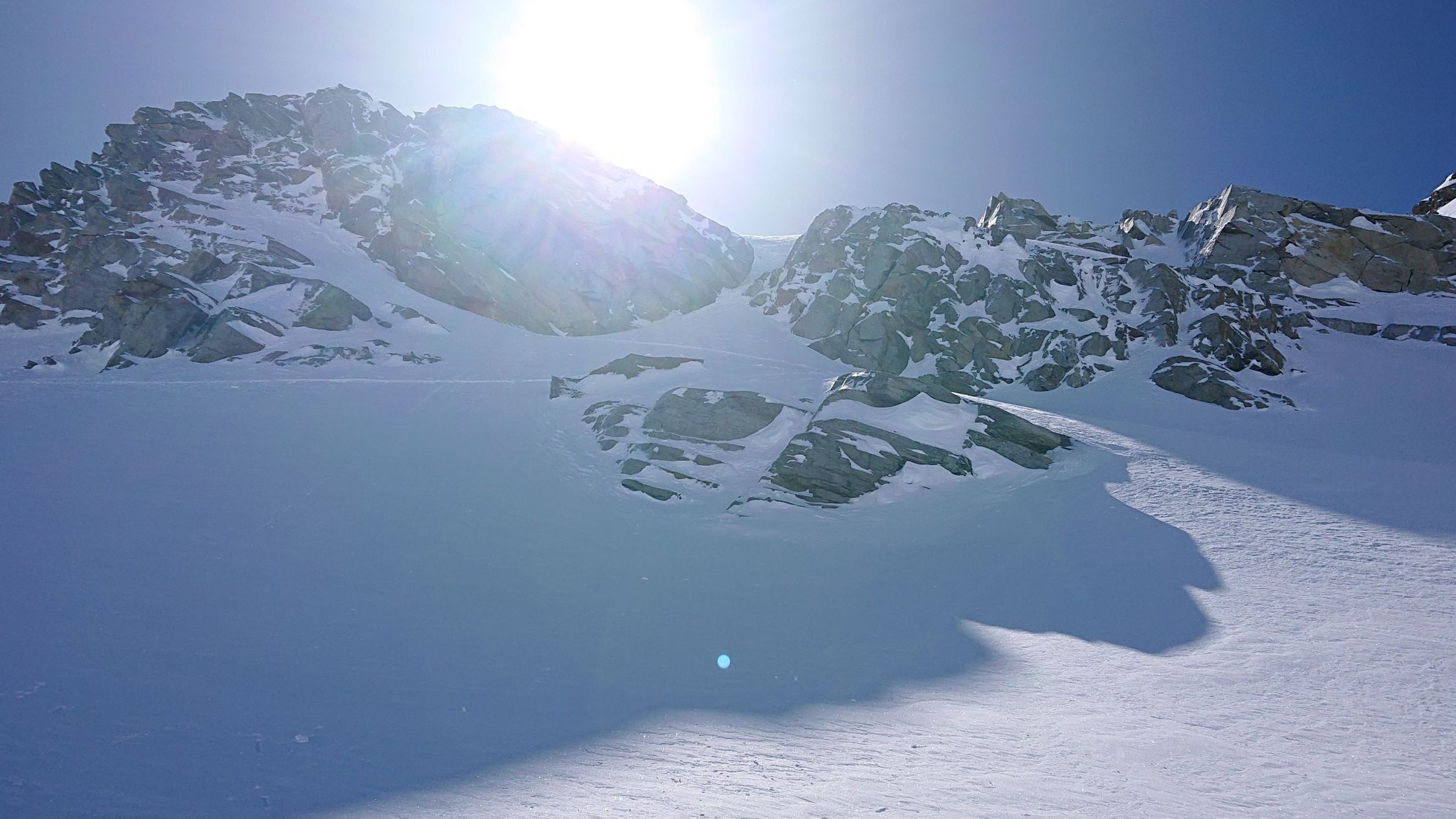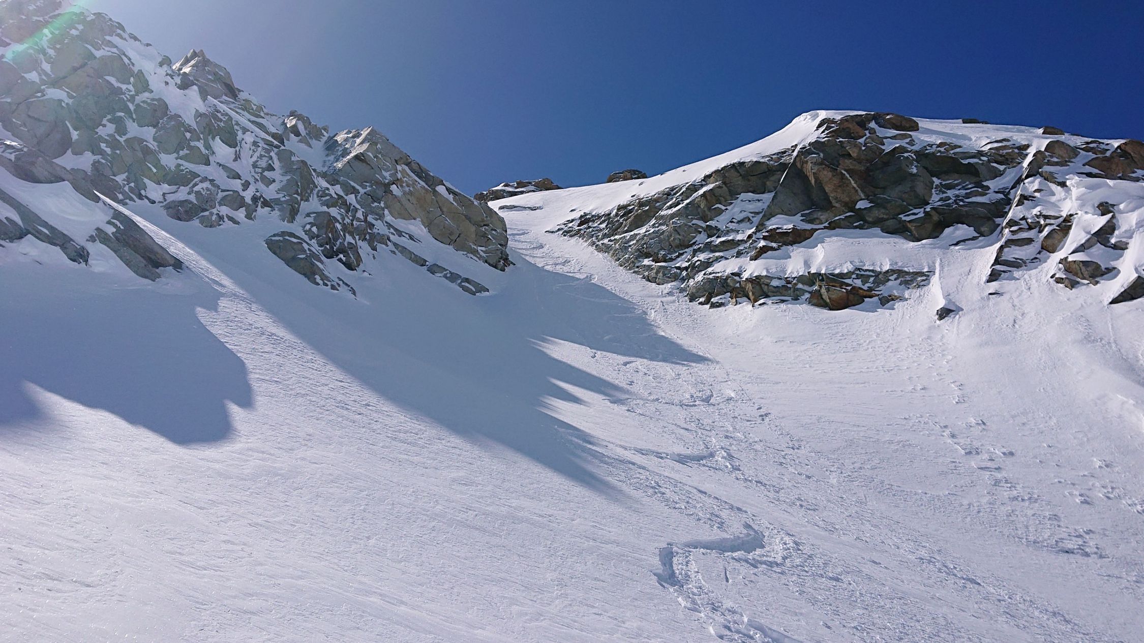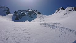 Abfahrt super durch die rechte Rinne. Aber auch hier wird man kaum mit Skiern aufsteigen können. Zu steil, zu eng.
