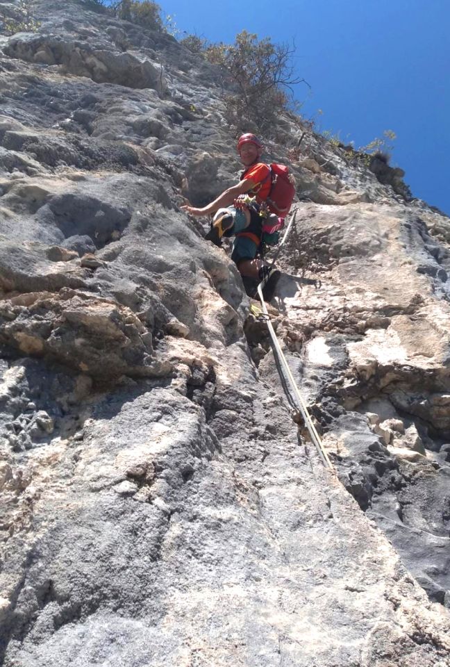SL11: Lang, 48 m, Wahnsinnig schöne Steilplatte mit vielen Leisten und Schüppchen. Schwierigkeiten nicht so hoch (im Vergleich zum Rest der Route) aber eindrucksvoll, einsam für den Vorsteiger (bei uns war es schattig, kalt und sehr windig), und mit etwas weiteren Hakenabständen als Rest der Route: Grande Finale