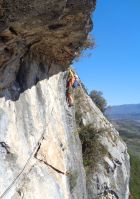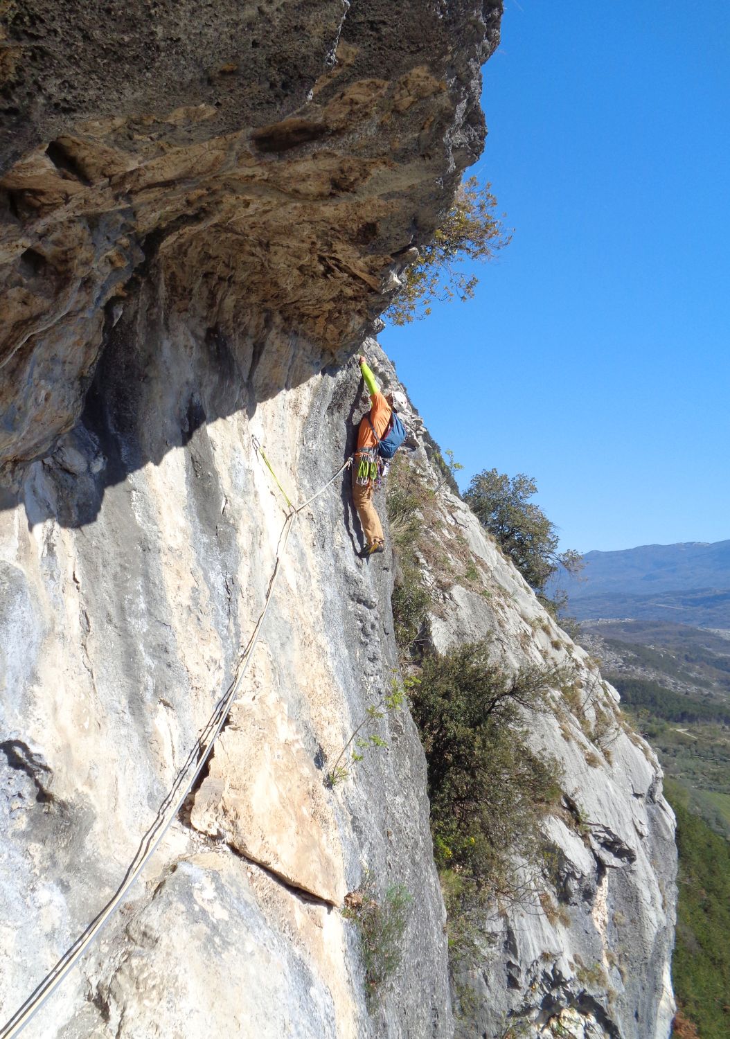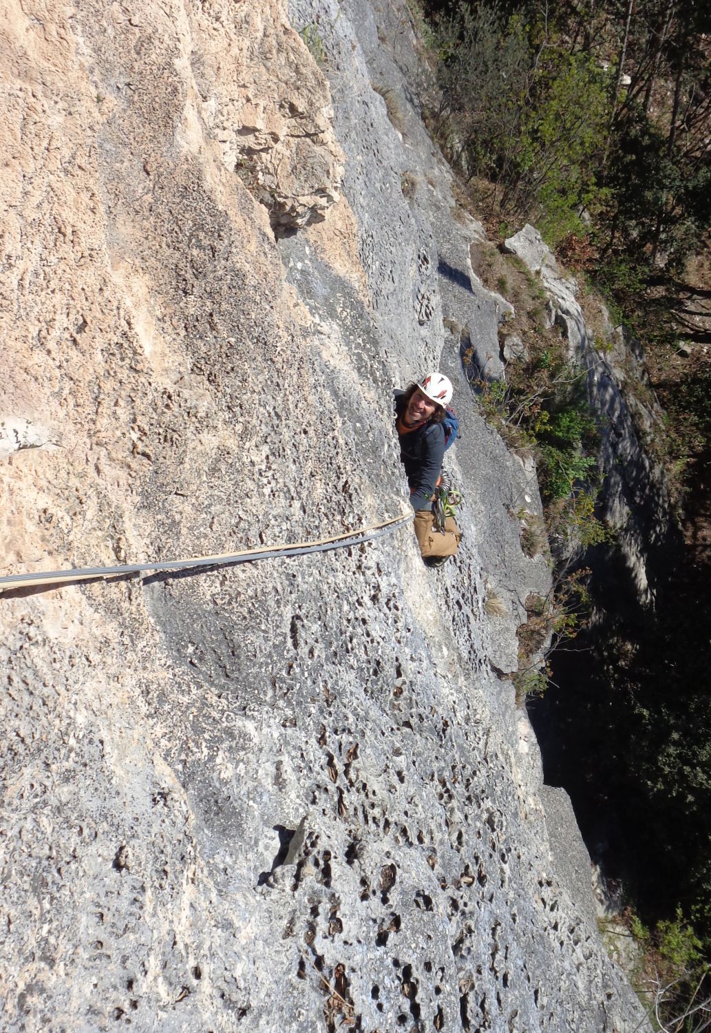SL1: das erste Dach lässt sich A0 machen, ansonsten sehr athletisch, gefühlt eher hart 6b, als das angegebene 6a, kann aber vom Kaltstart kommen. Danach extremst schöne Tropflochkletterei.