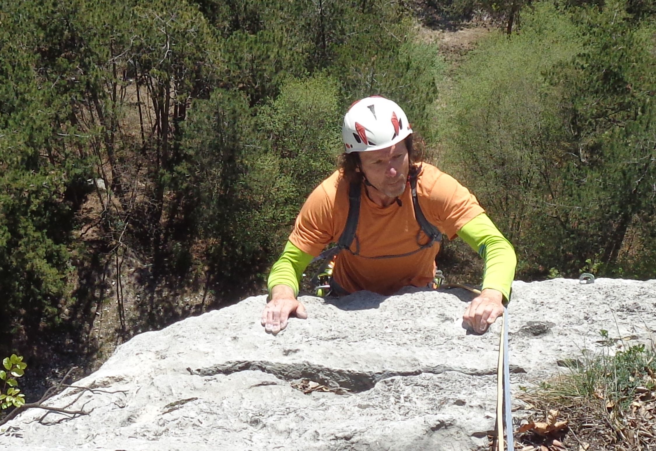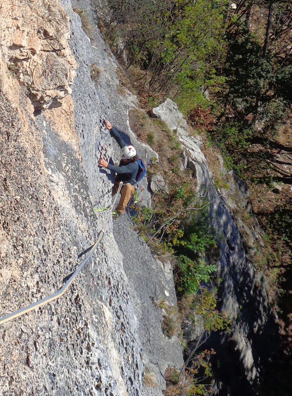 SL5: lang (48 m). Interessante Routenführung. Endet im Wald an Sanduhrschlinge.
