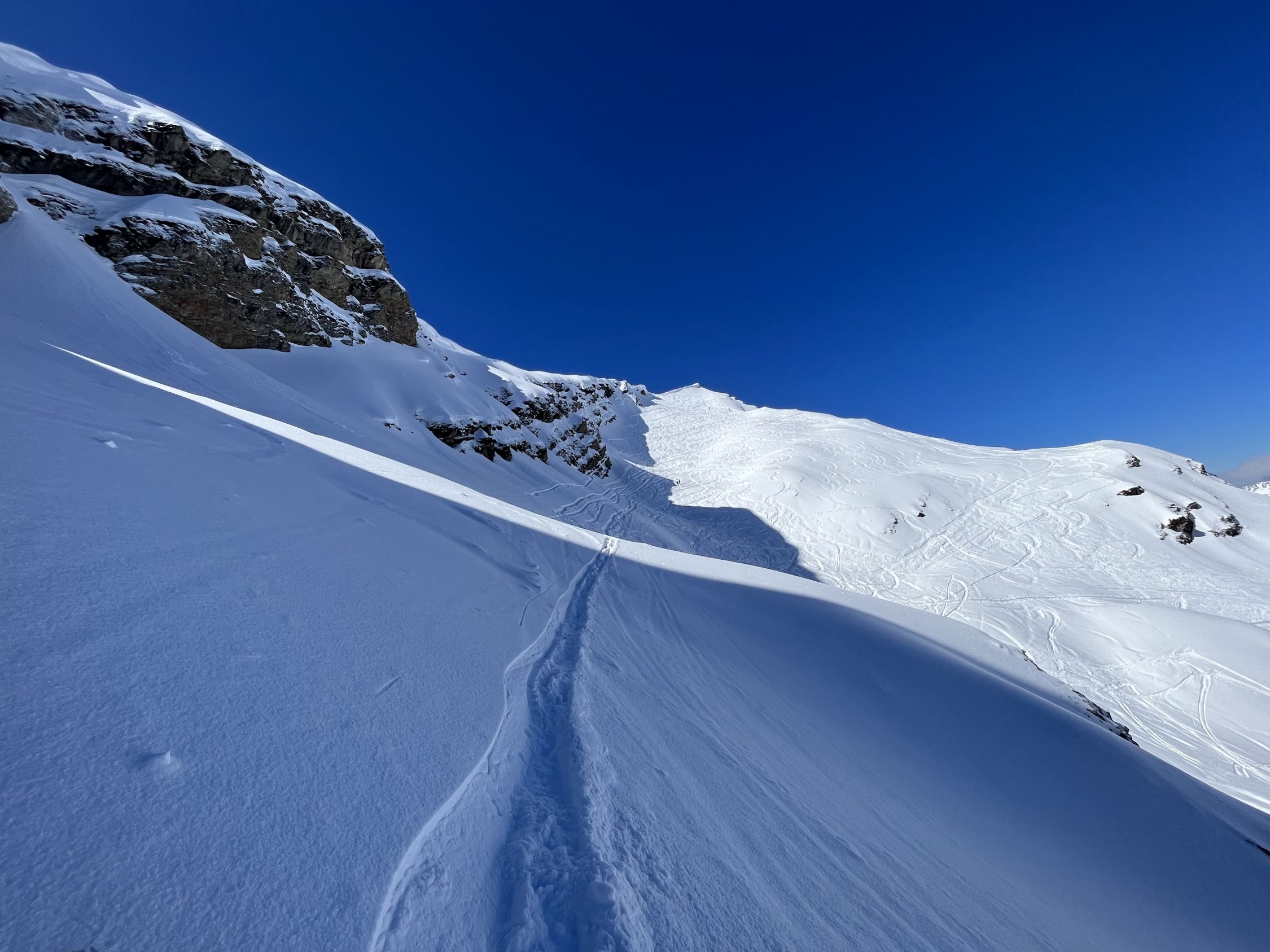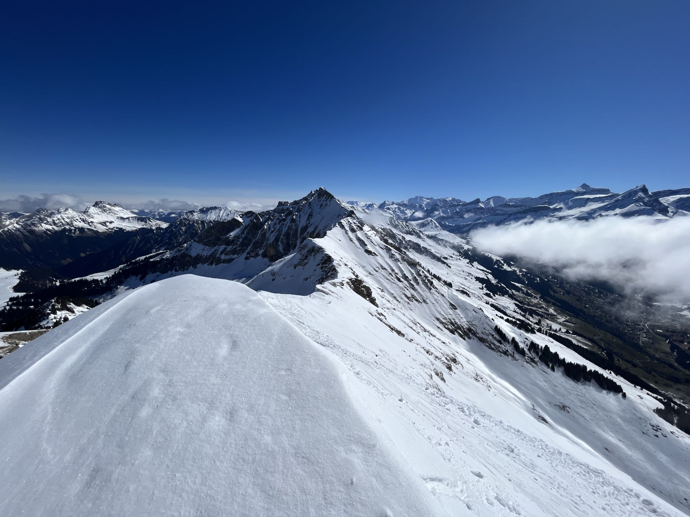 Start auf dem Col des Mosses. Aufstieg am Morgen auf der Skipiste noch machbar. Am Mittag mussten wir das letzte Stück runter laufen. Aufstieg via Lac Lioson bis zum Gipfel. Danach gute Verhältnisse bis auf den Gipfel. Abfahrt bis in den Sattel (Pkt. 2079) und dann Abfahrt via Buvettes des Lacs zurück auf den Col des Mosses. 2 Skitürler haben sich in der Abfahrt sogar in die N-Wand getraut. Schöner Pulverschnee