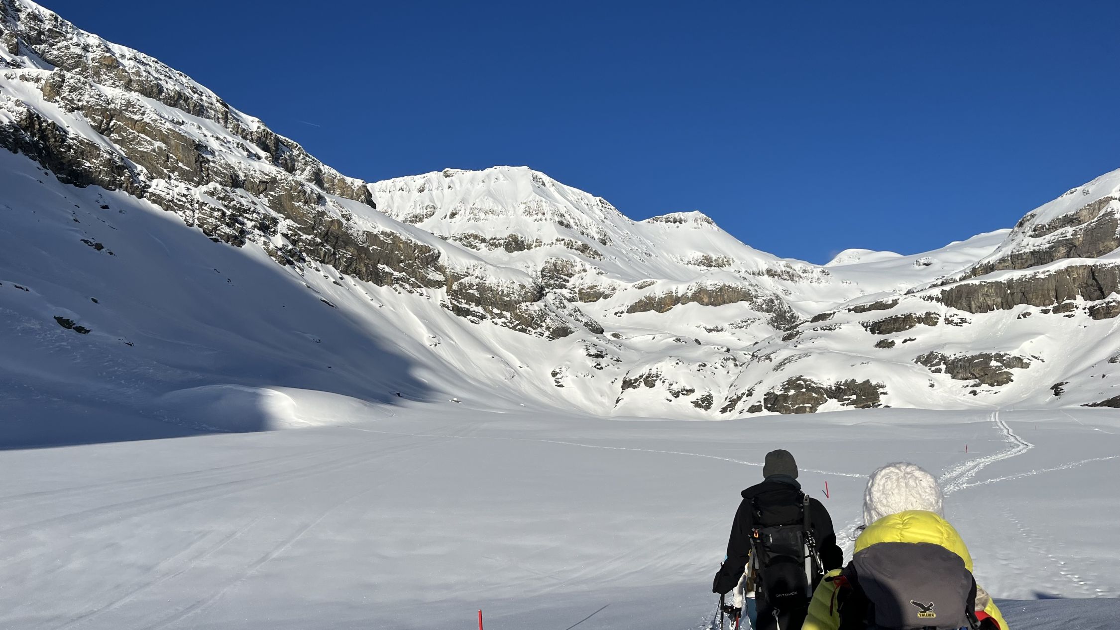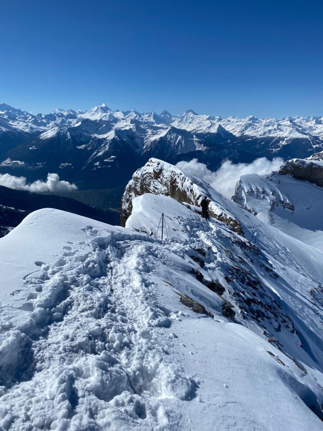 Durch den Schneefall der letzten Tag ergaben sich prachtvolle Bedingungen. Auch die Sonne zeigt sich von der besten Seite. Um 07:00 Uhr Start bei der Gemmilodge mit gleiten über den Lämmereboden. Bei der Abzweigung gute Sicht auf den Aufstiegsrücken. Alte Lawinenrückstände sind mit Neuschnee bedeckt. Kleinere Lawinen auf der rechten Seite beim Fels schon runter. Bis zum Sattel gute Skitourenbedingungen. Gipfel mit Steigeisen bestiegen. War ein Gemisch von Fels und Schnee. Abfahrt in schönstem Pulverschnee.