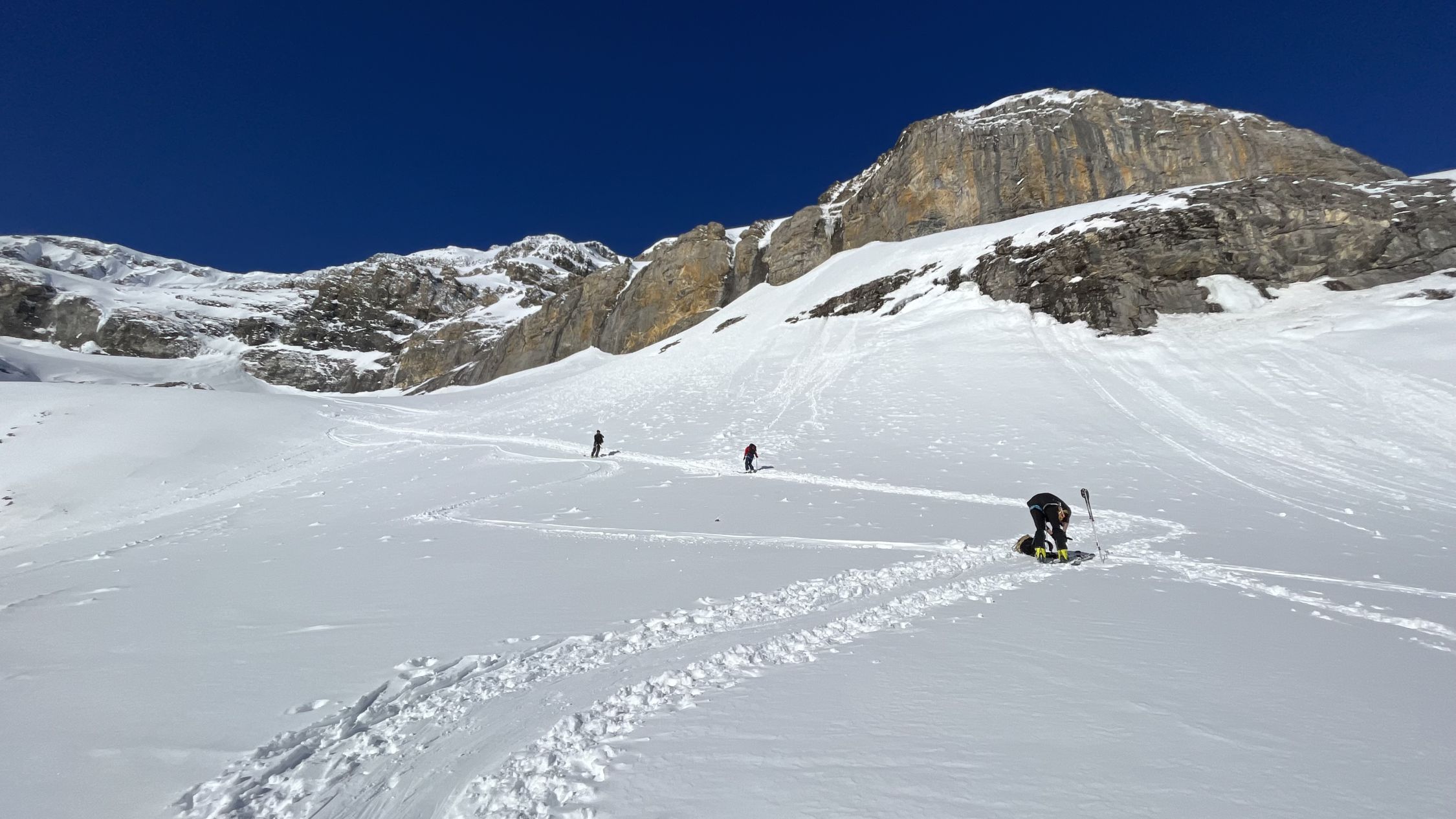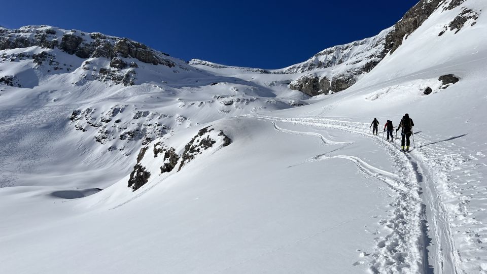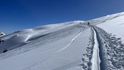 Start um 07:00 bei der Gemmilodge. Gleiten über den Lämmerenboden bis zum Übergang. Einsatz von Harscheisen da der Schnee in der Nacht stark gefroren war. Weiter ging es auf Fellen der Aufstiegslinie entlang. Die Spur auf den Gletscher war ohne grössere Probleme zu meistern. Auf dem Gletscher keine Spalten zu sehen. Der Gipfel war durch den Wind bearbeitet worden. Harte und wellenartige Oberflächen, aber gut begehbar. Abfahrt über den Gletscher im Pulverschnee bis auf den Lämmerenboden.
