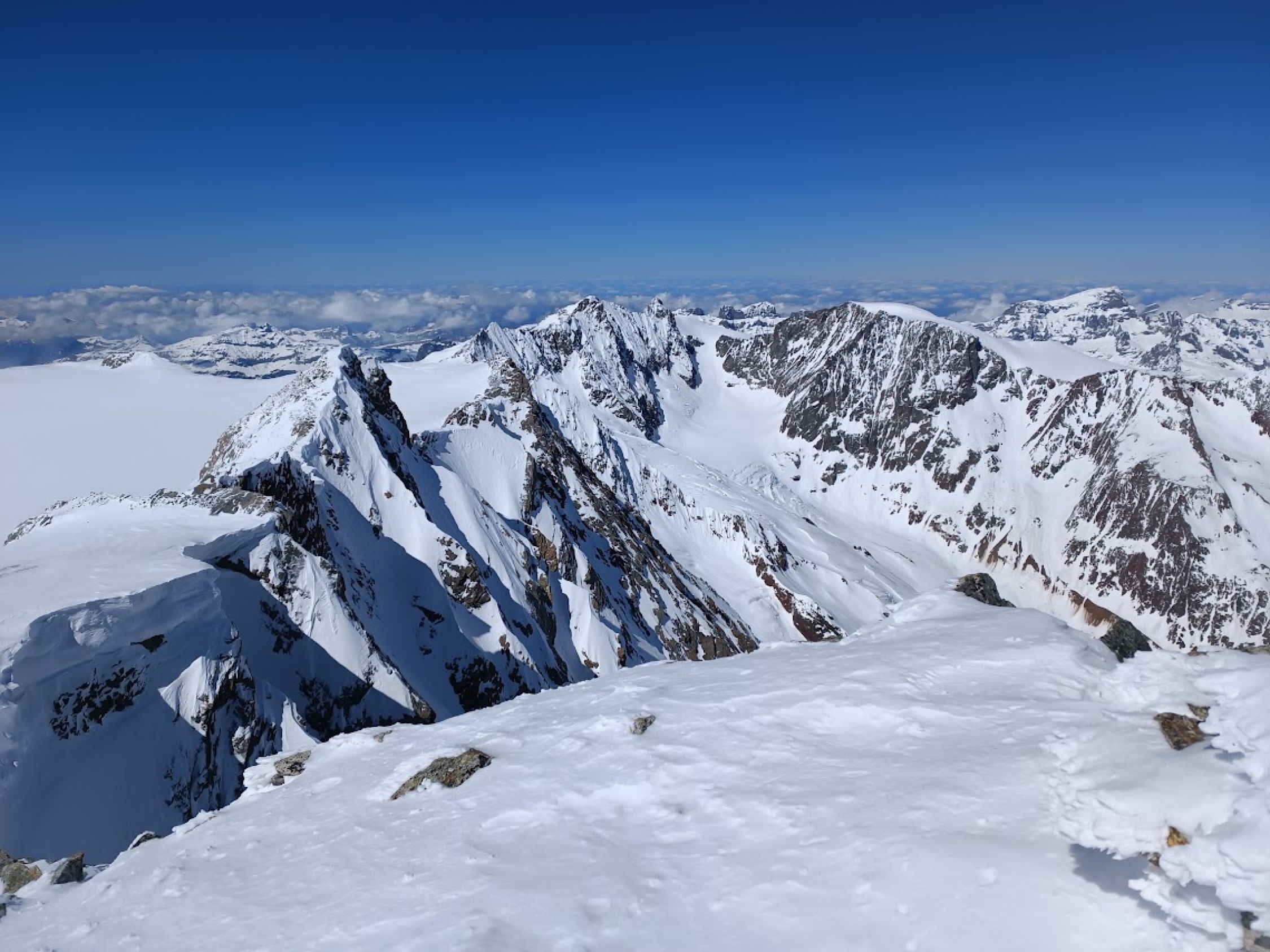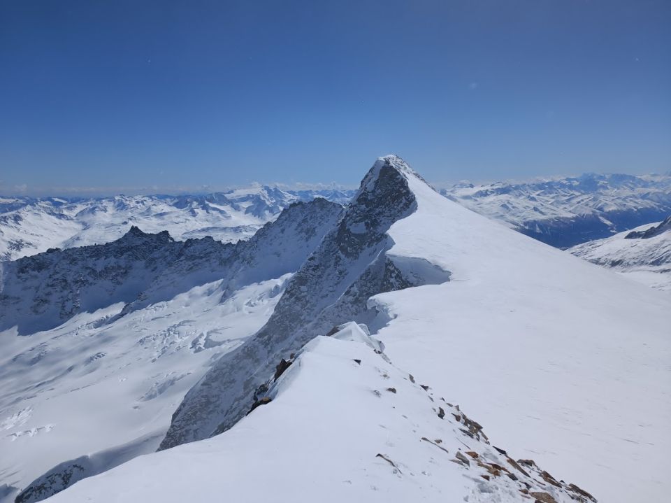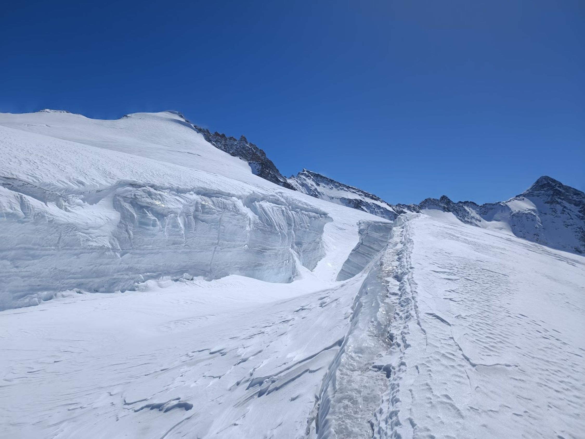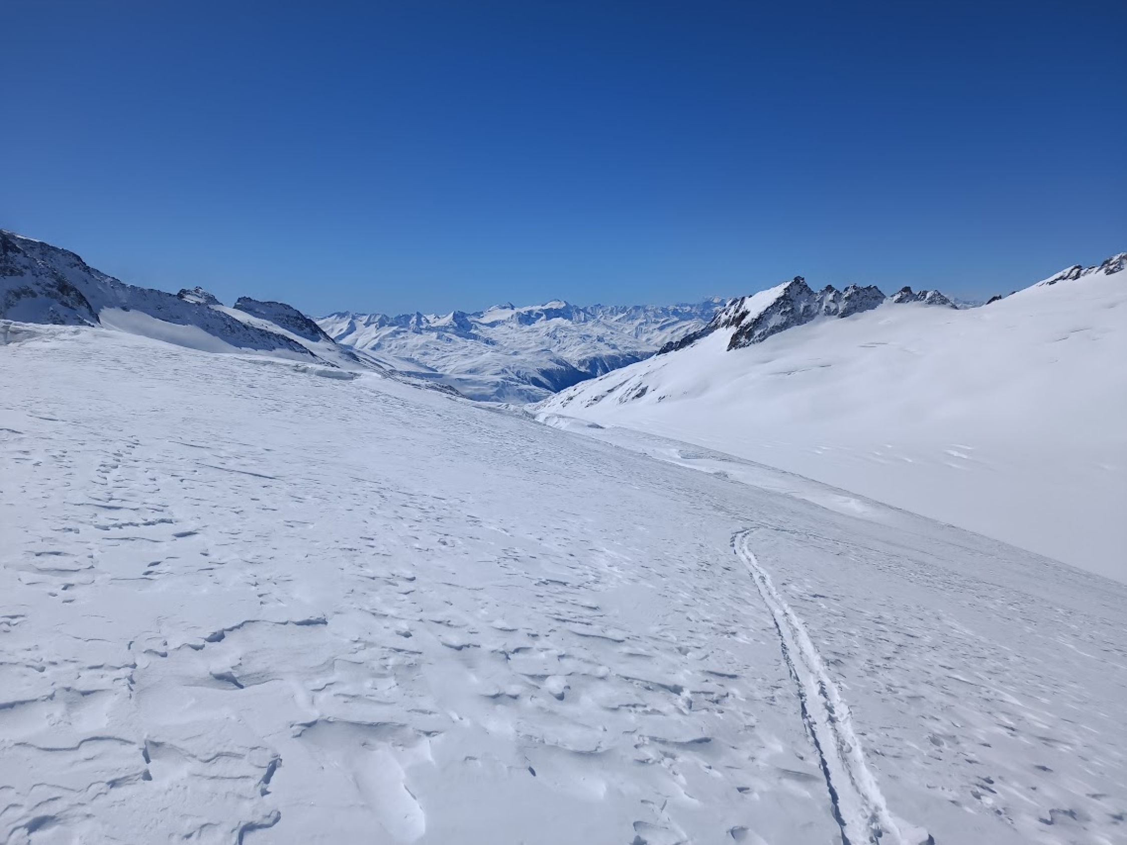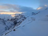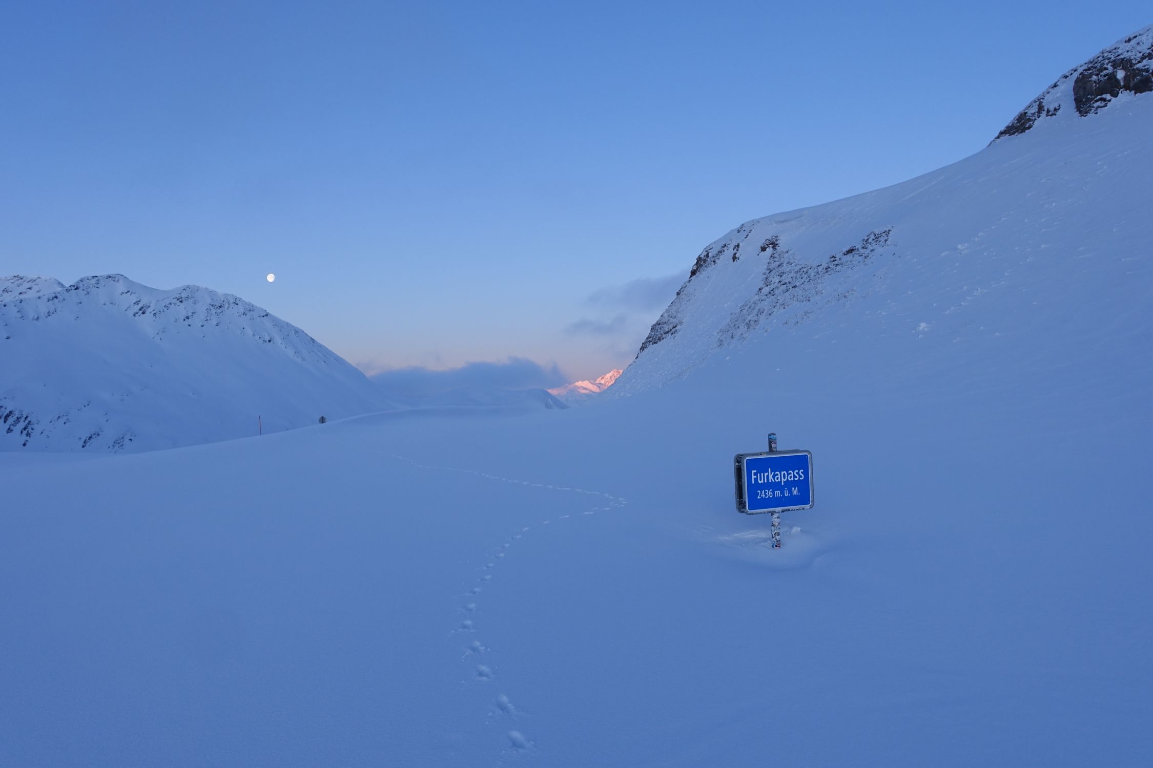 Nach einer stürmischen kalten Biwaknacht ging's vom Furkapass 3km und 200Hm hinab nach Belvedere. Die kurze steile Querung direkt hinter dem Gebäude beim Abstieg zum Rhonegletscher war bei leicht vereistem ungespurtem Schnee die technisch anspruchsvollste Stelle. Der Aufstieg über den gut eingeschneiten Gletscher war trotz mehrer Spaltenzonen gut machbar, wenn auch etwas anstrengend, da ich die 11km und 1450 Hm hoch zum Gipfel bei zum Teil weichem Schnee selbst spuren musste. Bei der Abfahrt Pulverschnee im oberen Bereich, den flachen mittleren Abschnitt muss man schieben, im unteren Abschnitt harschiger Schnee.