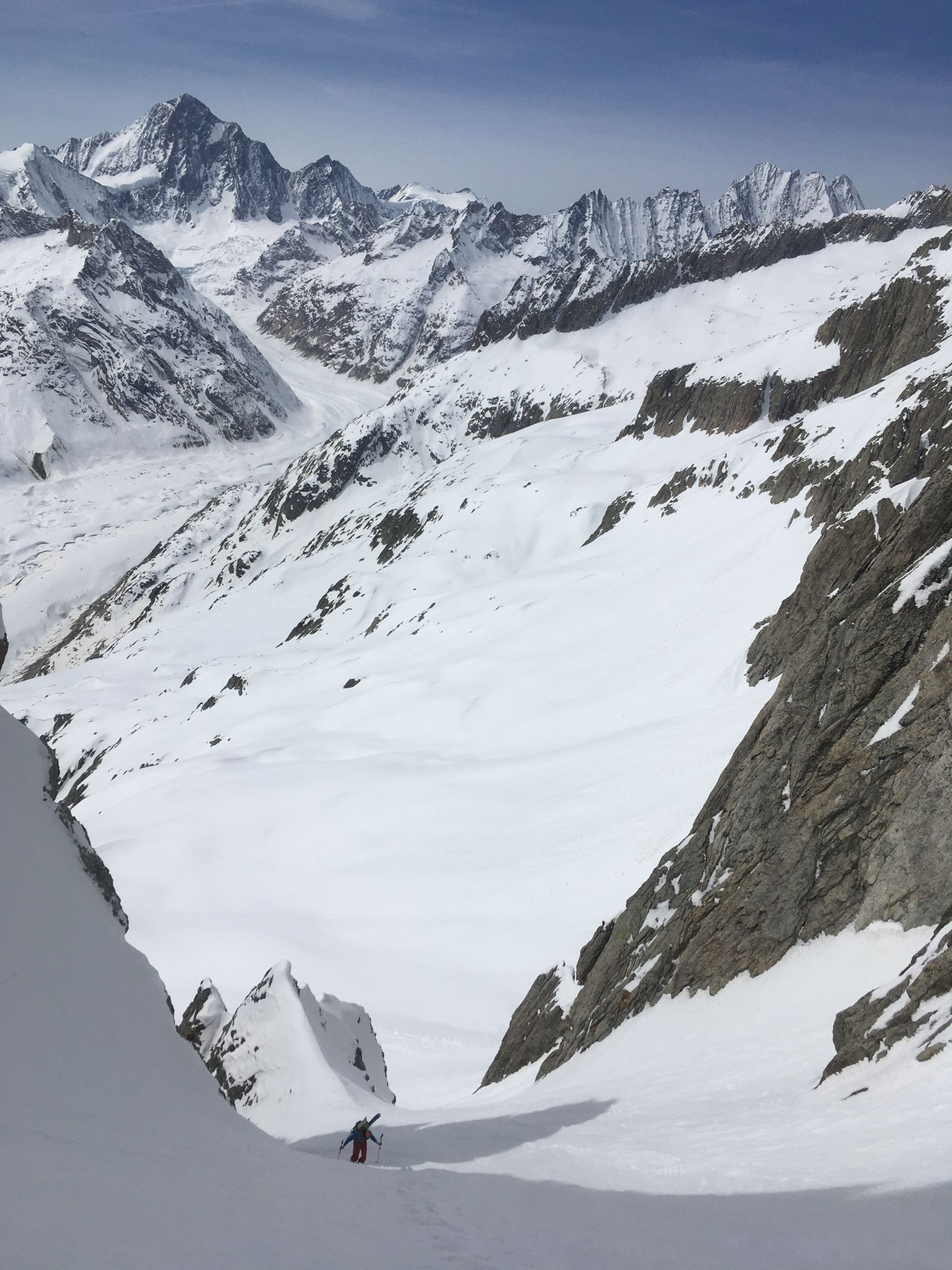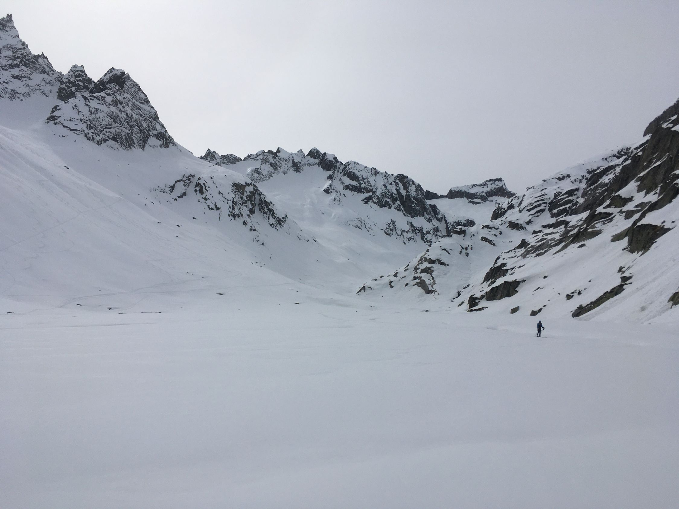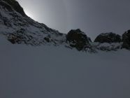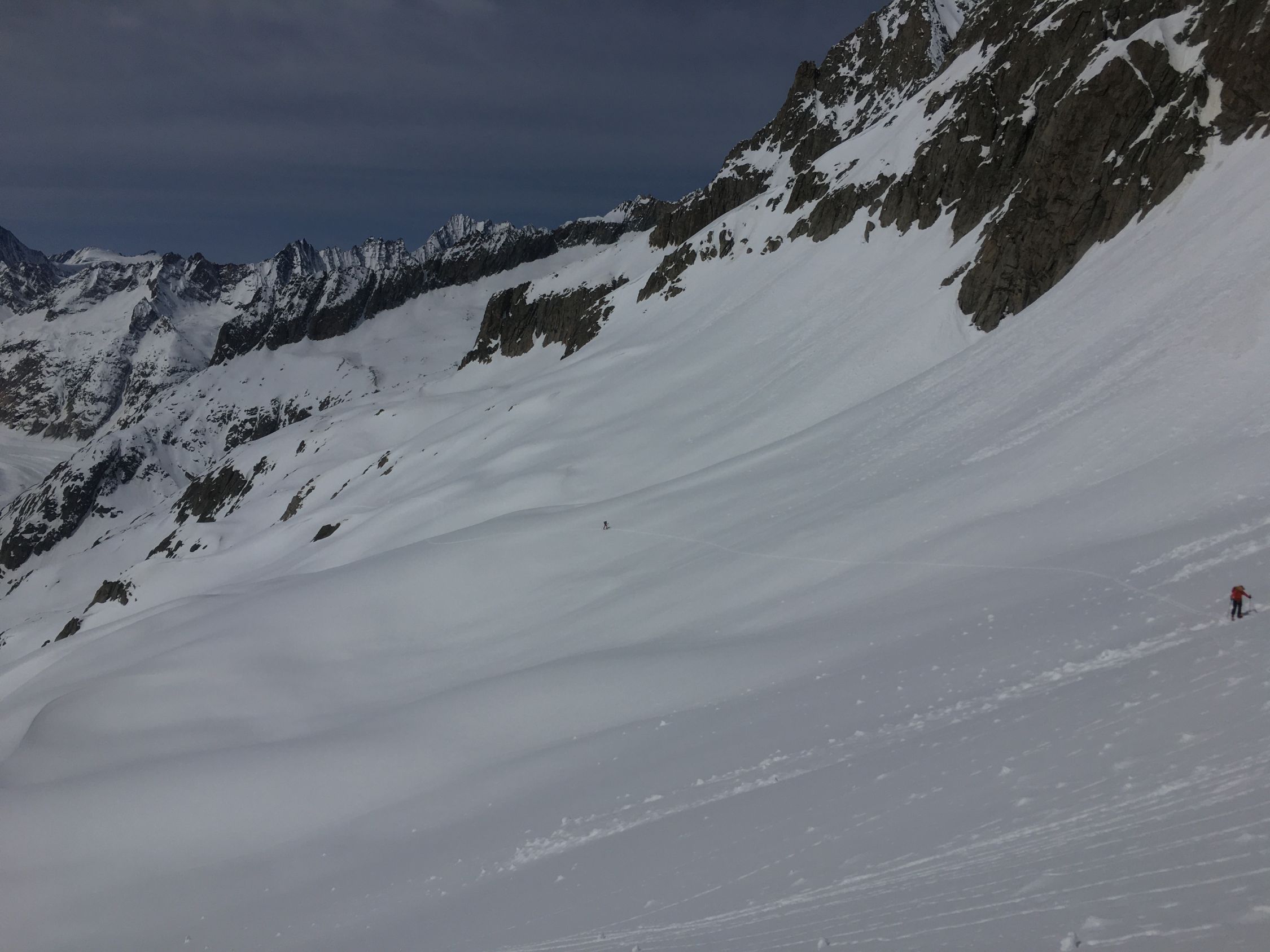 Südhänge ideal gefroren, genügend Schnee auf der gesamten Route. Mühsame Stapfarbeit durch das Westcouloir. Wir seilen wegen kritischer Lawinenlage in den Gipfelhang, kein Schneebrett ausgelöst. Die Steilstufe im Couloir überwinden wir mit 2 Mal 20m abseilen. Pulverschnee bis in den Talgrund, danach viele Spuren und feuchter Schnee bis zur Staumauer.