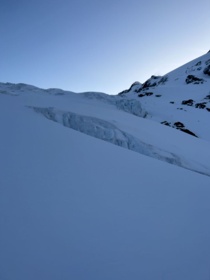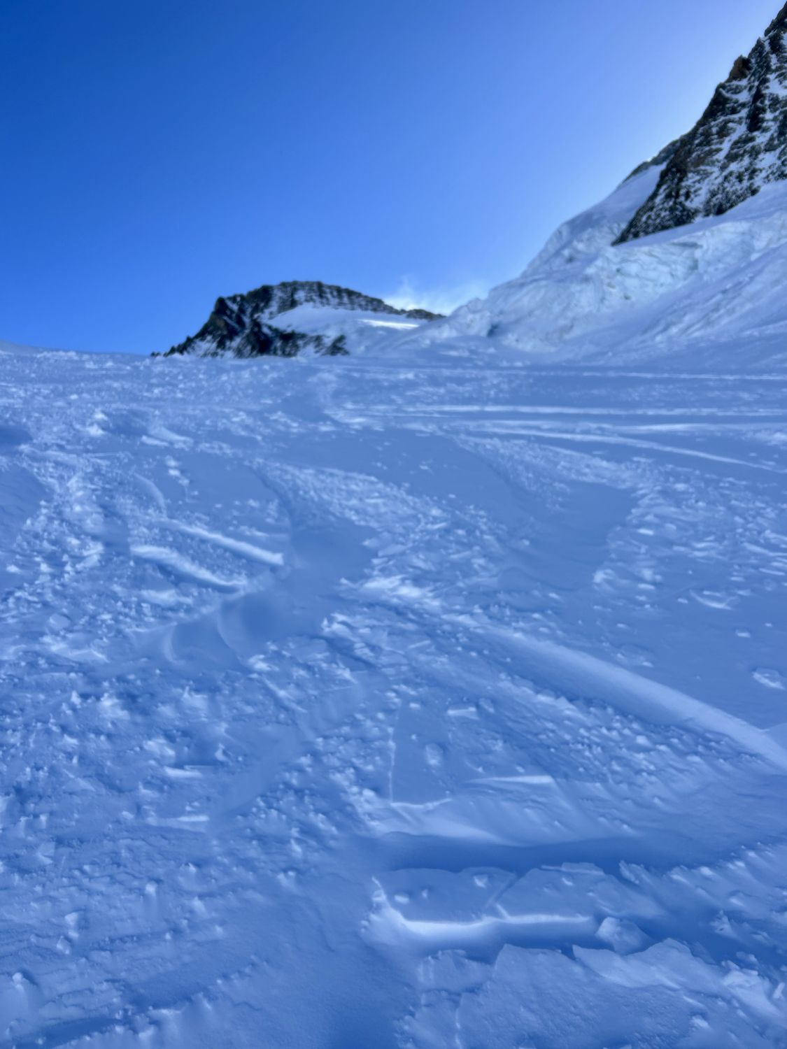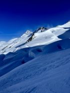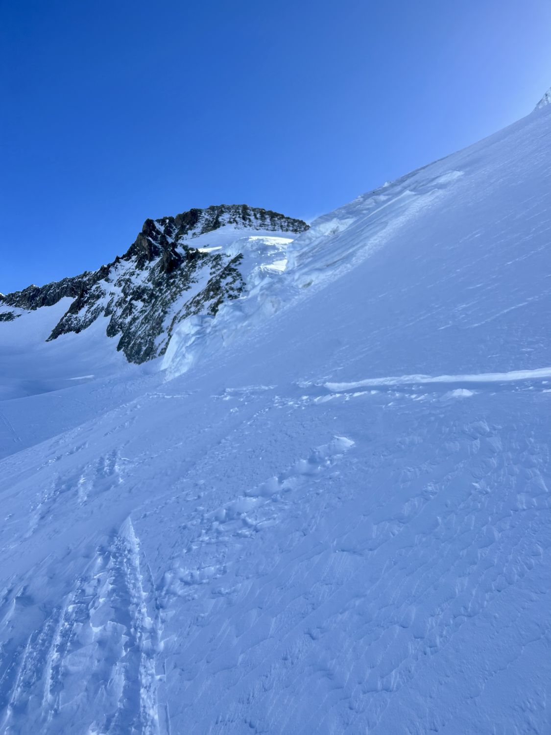 Gletscherbrüche im unteren Teil sehr gut eingeschneit. Nach dem vielen Neuschnee kann man die gesamte Route bis zum Skidepot mit Ski gehen, Harscheisen im oberen Teil angenehm, aber nicht mal ganz zwingend nötig. Am Grat selbst eher wenig Schnee, aber gerade so viel, dass der obere Teil nicht zu heikel ist. Abfahrt vom Skidepot bis aufs Ewigschneefeld traumhaft, allerbester Schnee. Aufgrund der Kälte haben die meisten umgedreht, es waren auf dieser Route nur wir am Gipfel.
