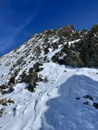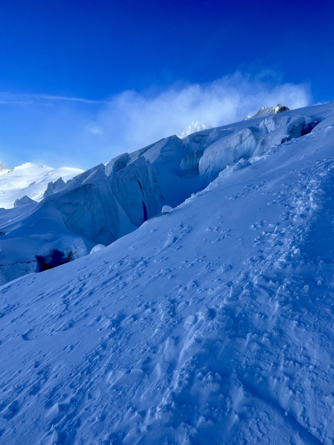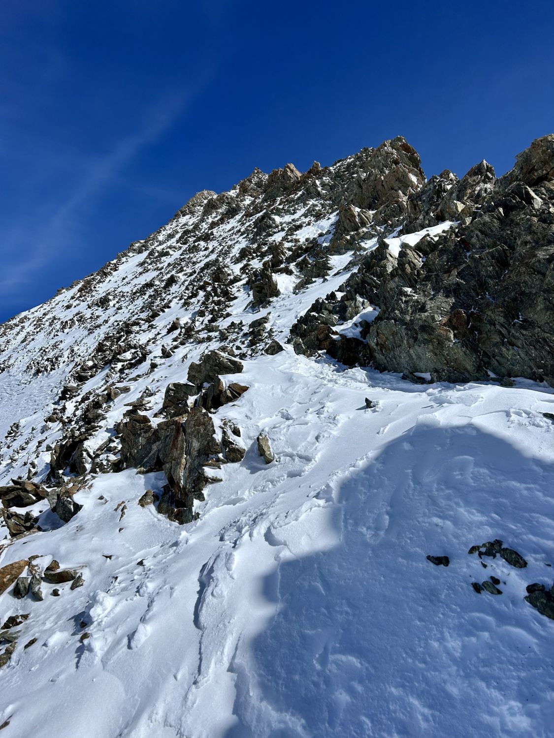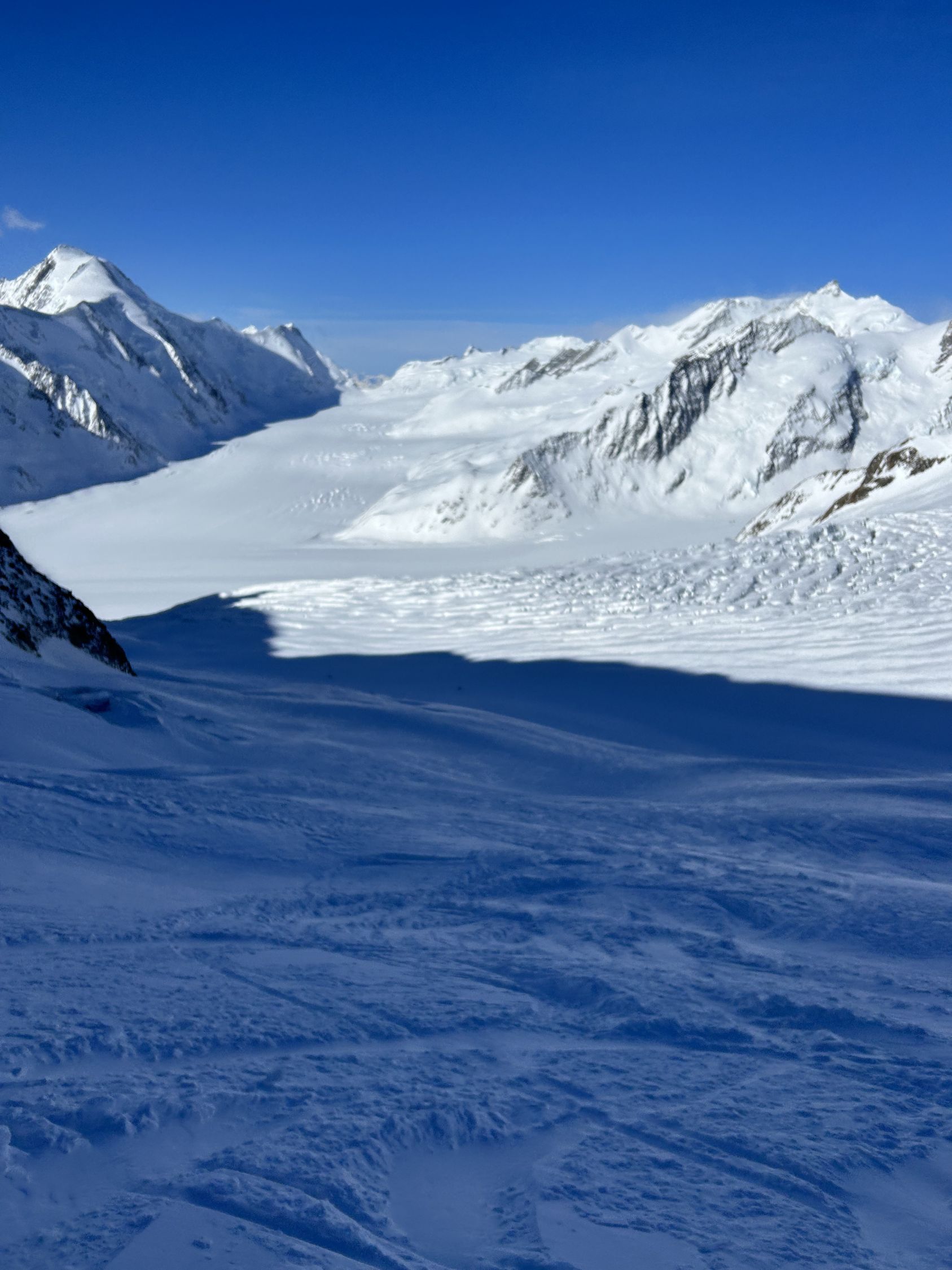 Gletscherbrüche im unteren Teil sehr gut eingeschneit. Nach dem vielen Neuschnee kann man die gesamte Route bis zum Skidepot mit Ski gehen, Harscheisen im oberen Teil angenehm, aber nicht mal ganz zwingend nötig. Am Grat selbst eher wenig Schnee, aber gerade so viel, dass der obere Teil nicht zu heikel ist. Abfahrt vom Skidepot bis aufs Ewigschneefeld traumhaft, allerbester Schnee. Aufgrund der Kälte haben die meisten umgedreht, es waren auf dieser Route nur wir am Gipfel.