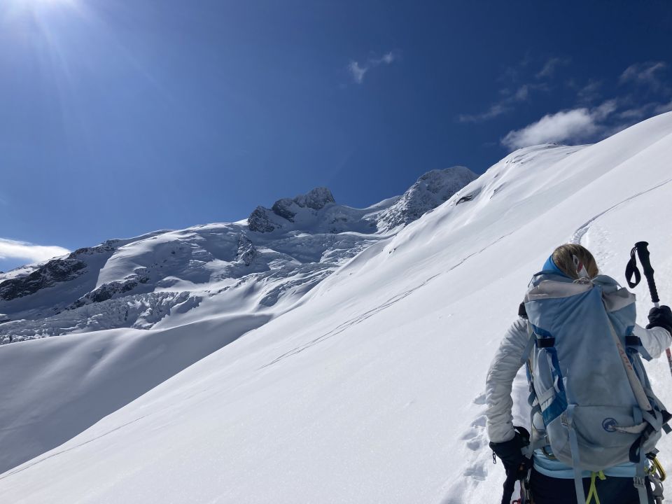 Pulverschnee auf der ganzen Route. Wir konnten den ganzen Aufstieg ohne Harscheisen sehr gut machen. Am Gipfelgrat sind Steigeisen nützlich.